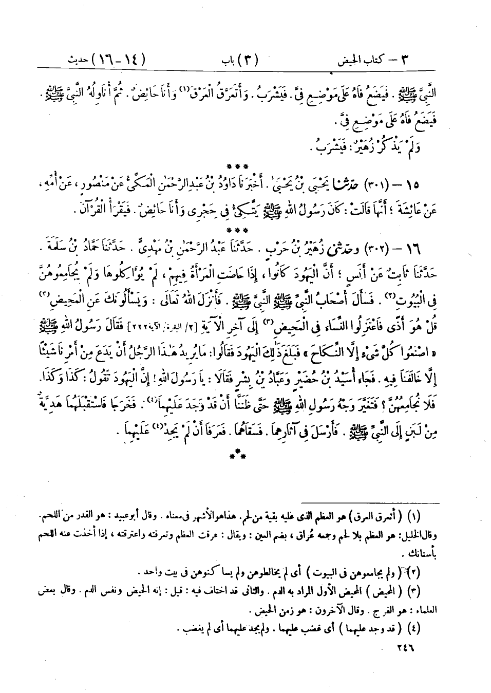 16 - (302) وَحَدَّثَنِي زُهَيْرُ بْنُ حَرْبٍ، حَدَّثَنَا عَبْدُ الرَّحْمَنِ بْنُ مَهْدِيٍّ، حَدَّثَنَا حَمَّادُ بْنُ سَلَمَةَ، حَدَّثَنَا ثَابِتٌ، عَنْ أَنَسٍ أَنَّ الْيَهُودَ كَانُوا إِذَا حَاضَتِ الْمَرْأَةُ فِيهِمْ لَمْ يُؤَاكِلُوهَا، وَلَمْ يُجَامِعُوهُنَّ فِي الْبُيُوتِ فَسَأَلَ أَصْحَابُ النَّبِيِّ صَلَّى اللهُ عَلَيْهِ وَسَلَّمَ النَّبِيَّ صَلَّى اللهُ عَلَيْهِ وَسَلَّمَ فَأَنْزَلَ اللهُ تَعَالَى {وَيَسْأَلُونَكَ عَنِ الْمَحِيضِ قُلْ هُوَ أَذًى فَاعْتَزِلُوا النِّسَاءَ فِي الْمَحِيضِ} [البقرة: 222] إِلَى آخِرِ الْآيَةِ، فَقَالَ رَسُولُ اللهِ صَلَّى اللهُ عَلَيْهِ وَسَلَّمَ: «§اصْنَعُوا كُلَّ شَيْءٍ إِلَّا النِّكَاحَ» فَبَلَغَ ذَلِكَ الْيَهُودَ، فَقَالُوا: مَا يُرِيدُ هَذَا الرَّجُلُ أَنْ يَدَعَ مِنْ أَمْرِنَا شَيْئًا إِلَّا خَالَفَنَا فِيهِ، فَجَاءَ أُسَيْدُ بْنُ حُضَيْرٍ، وَعَبَّادُ بْنُ بِشْرٍ فَقَالَا يَا رَسُولَ اللهِ، إِنَّ الْيَهُودَ تَقُولُ: كَذَا وَكَذَا، فَلَا نُجَامِعُهُنَّ؟ فَتَغَيَّرَ وَجْهُ رَسُولِ اللهِ صَلَّى اللهُ عَلَيْهِ وَسَلَّمَ حَتَّى ظَنَنَّا أَنْ قَدْ وَجَدَ عَلَيْهِمَا، فَخَرَجَا فَاسْتَقْبَلَهُمَا هَدِيَّةٌ مِنْ لَبَنٍ إِلَى النَّبِيِّ صَلَّى اللهُ عَلَيْهِ وَسَلَّمَ، فَأَرْسَلَ فِي آثَارِهِمَا فَسَقَاهُمَا، فَعَرَفَا أَنْ لَمْ يَجِدْ عَلَيْهِمَا
