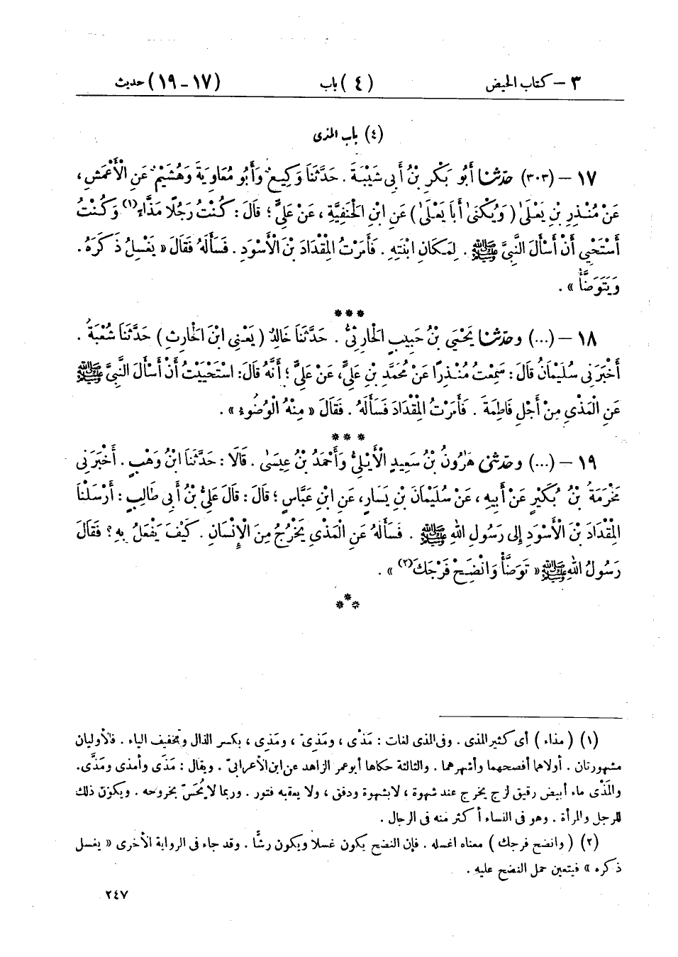 17 - (303) حَدَّثَنَا أَبُو بَكْرِ بْنُ أَبِي شَيْبَةَ، حَدَّثَنَا وَكِيعٌ، وَأَبُو مُعَاوِيَةَ، وَهُشَيْمٌ، عَنِ الْأَعْمَشِ، عَنْ مُنْذِرِ بْنِ يَعْلَى، - وَيُكْنَى أَبَا يَعْلَى - عَنِ ابْنِ الْحَنَفِيَّةِ، عَنْ عَلِيٍّ قَالَ: كُنْتُ رَجُلًا مَذَّاءً وَكُنْتُ أَسْتَحْيِي أَنْ أَسْأَلَ النَّبِيَّ صَلَّى اللهُ عَلَيْهِ وَسَلَّمَ لِمَكَانِ ابْنَتِهِ فَأَمَرْتُ الْمِقْدَادَ بْنَ الْأَسْوَدِ فَسَأَلَهُ فَقَالَ: «§يَغْسِلُ ذَكَرَهُ وَيَتَوَضَّأُ»