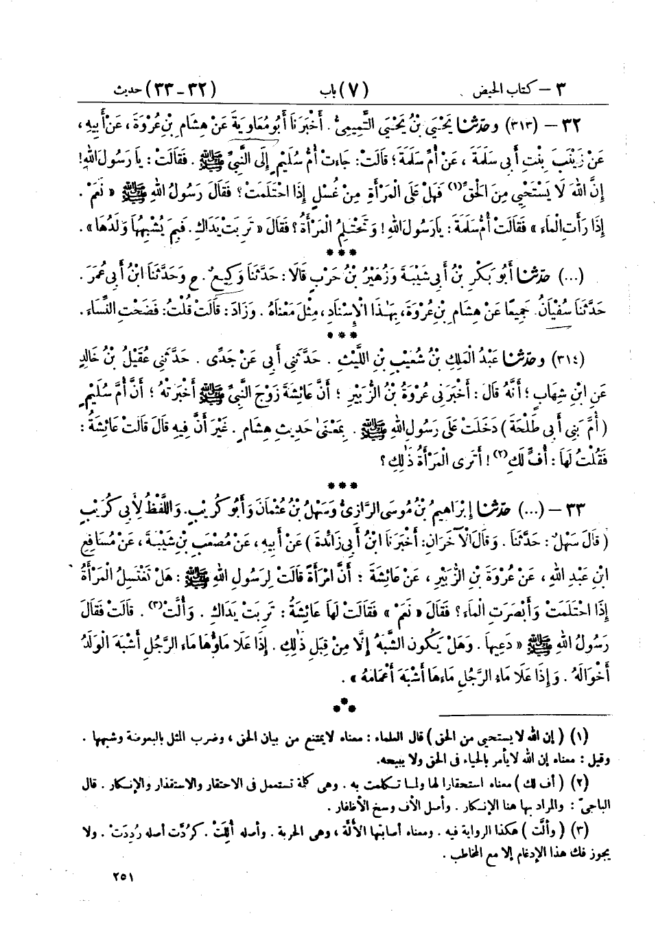 32 - (313) وَحَدَّثَنَا يَحْيَى بْنُ يَحْيَى التَّمِيمِيُّ، أَخْبَرَنَا أَبُو مُعَاوِيَةَ، عَنْ هِشَامِ بْنِ عُرْوَةَ، عَنْ أَبِيهِ، عَنْ زَيْنَبَ بِنْتِ أَبِي سَلَمَةَ، عَنْ أُمِّ سَلَمَةَ قَالَتْ: جَاءَتْ أَمُّ سُلَيْمٍ إِلَى النَّبِيِّ صَلَّى اللهُ عَلَيْهِ وَسَلَّمَ فَقَالَتْ: يَا رَسُولَ اللهِ، إِنَّ اللهِ لَا يَسْتَحْيِي مِنَ الْحَقِّ، فَهَلْ §عَلَى الْمَرْأَةِ مِنْ غُسْلٍ إِذَا احْتَلَمَتْ؟ فَقَالَ رَسُولُ اللهِ صَلَّى اللهُ عَلَيْهِ وَسَلَّمَ: «نَعَمْ، إِذَا رَأَتِ الْمَاءَ» فَقَالَتْ أُمُّ سَلَمَةَ: يَا رَسُولَ اللهِ، وَتَحْتَلِمُ الْمَرْأَةُ؟ فَقَالَ: «تَرِبَتْ يَدَاكِ، فَبِمَ يُشْبِهُهَا وَلَدُهَا»