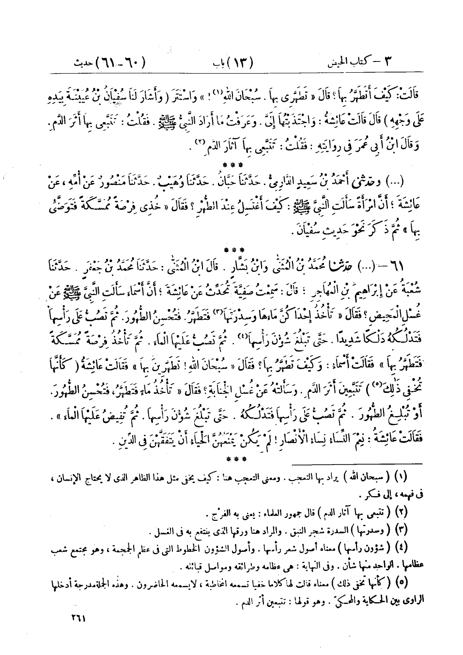 61 - (332) حَدَّثَنَا مُحَمَّدُ بْنُ الْمُثَنَّى، وَابْنُ بَشَّارٍ، قَالَ ابْنُ الْمُثَنَّى: حَدَّثَنَا مُحَمَّدُ بْنُ جَعْفَرٍ، حَدَّثَنَا شُعْبَةُ، عَنْ إِبْرَاهِيمَ بْنِ الْمُهَاجِرِ، قَالَ: سَمِعْتُ صَفِيَّةَ، تُحَدِّثُ عَنْ عَائِشَةَ، أَنَّ أَسْمَاءَ سَأَلَتِ النَّبِيَّ صَلَّى اللهُ عَلَيْهِ وَسَلَّمَ عَنْ §غُسْلِ الْمَحِيضِ؟ فَقَالَ: «تَأْخُذُ إِحْدَاكُنَّ مَاءَهَا وَسِدْرَتَهَا، فَتَطَهَّرُ فَتُحْسِنُ الطُّهُورَ، ثُمَّ تَصُبُّ عَلَى رَأْسِهَا فَتَدْلُكُهُ دَلْكًا شَدِيدًا حَتَّى تَبْلُغَ شُؤُونَ رَأْسِهَا، ثُمَّ تَصُبُّ عَلَيْهَا الْمَاءَ، ثُمَّ تَأْخُذُ فِرْصَةً مُمَسَّكَةً فَتَطَهَّرُ بِهَا» فَقَالَتْ أَسْمَاءُ: وَكَيْفَ تَطَهَّرُ بِهَا؟ فَقَالَ: «سُبْحَانَ اللهِ، تَطَهَّرِينَ بِهَا» فَقَالَتْ عَائِشَةُ: كَأَنَّهَا تُخْفِي ذَلِكَ تَتَبَّعِينَ أَثَرَ الدَّمِ، وَسَأَلَتْهُ عَنْ غُسْلِ الْجَنَابَةِ؟ فَقَالَ: «تَأْخُذُ مَاءً فَتَطَهَّرُ فَتُحْسِنُ الطُّهُورَ أَوْ تُبْلِغُ الطُّهُورَ، ثُمَّ تَصُبُّ عَلَى رَأْسِهَا فَتَدْلُكُهُ حَتَّى تَبْلُغَ شُؤُونَ رَأْسِهَا، ثُمَّ تُفِيضُ عَلَيْهَا الْمَاءَ» فَقَالَتْ عَائِشَةُ: " نِعْمَ النِّسَاءُ نِسَاءُ الْأَنْصَارِ لَمْ يَكُنْ يَمْنَعُهُنَّ الْحَيَاءُ أَنْ يَتَفَقَّهْنَ فِي الدِّينِ.