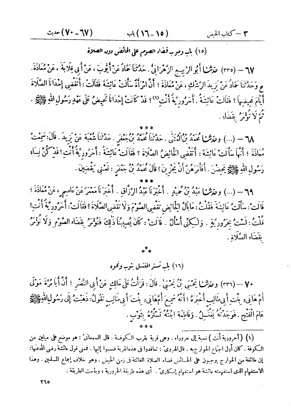 67 - (335) حَدَّثَنَا أَبُو الرَّبِيعِ الزَّهْرَانِيُّ، حَدَّثَنَا حَمَّادٌ، عَنْ أَيُّوبَ، عَنْ أَبِي قِلَابَةَ، عَنْ مُعَاذَةَ ح، وَحَدَّثَنَا حَمَّادٌ، عَنْ يَزِيدَ الرِّشْكِ، عَنْ مُعَاذَةَ، أَنَّ امْرَأَةً سَأَلَتْ عَائِشَةَ فَقَالَتْ: أَتَقْضِي إِحْدَانَا الصَّلَاةَ أَيَّامَ مَحِيضِهَا؟ فَقَالَتْ عَائِشَةُ: أَحَرُورِيَّةٌ أَنْتِ؟ قَدْ «§كَانَتْ إِحْدَانَا تَحِيضُ عَلَى عَهْدِ رَسُولِ اللهِ صَلَّى اللهُ عَلَيْهِ وَسَلَّمَ، ثُمَّ لَا تُؤْمَرُ بِقَضَاءٍ»
