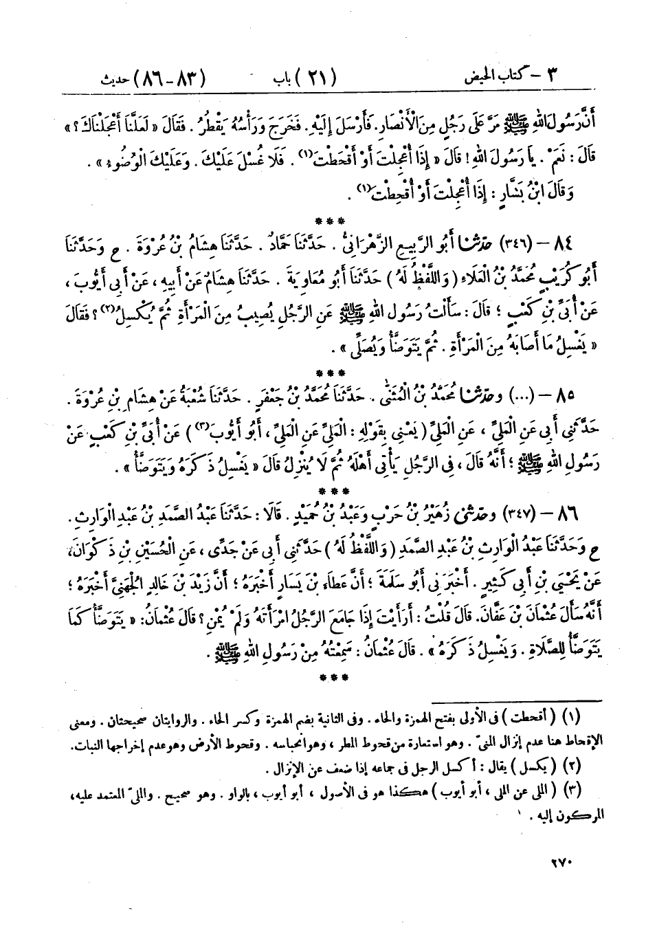 84 - (346) حَدَّثَنَا أَبُو الرَّبِيعِ الزَّهْرَانِيُّ، حَدَّثَنَا حَمَّادٌ، حَدَّثَنَا هِشَامُ بْنُ عُرْوَةَ ح، وَحَدَّثَنَا أَبُو كُرَيْبٍ مُحَمَّدُ بْنُ الْعَلَاءِ، - وَاللَّفْظُ لَهُ -، حَدَّثَنَا أَبُو مُعَاوِيَةَ، حَدَّثَنَا هِشَامٌ، عَنْ أَبِيهِ، عَنْ أَبِي أَيُّوبَ، عَنْ أُبَيِّ بْنِ كَعْبٍ، قَالَ: سَأَلْتُ رَسُولَ اللهِ صَلَّى اللهُ عَلَيْهِ وَسَلَّمَ عَنِ الرَّجُلِ يُصِيبُ مِنَ الْمَرْأَةِ ثُمَّ يُكْسِلُ؟ فَقَالَ: «§يَغْسِلُ مَا أَصَابَهُ مِنَ الْمَرْأَةِ ثُمَّ يَتَوَضَّأُ، وَيُصَلِّي»