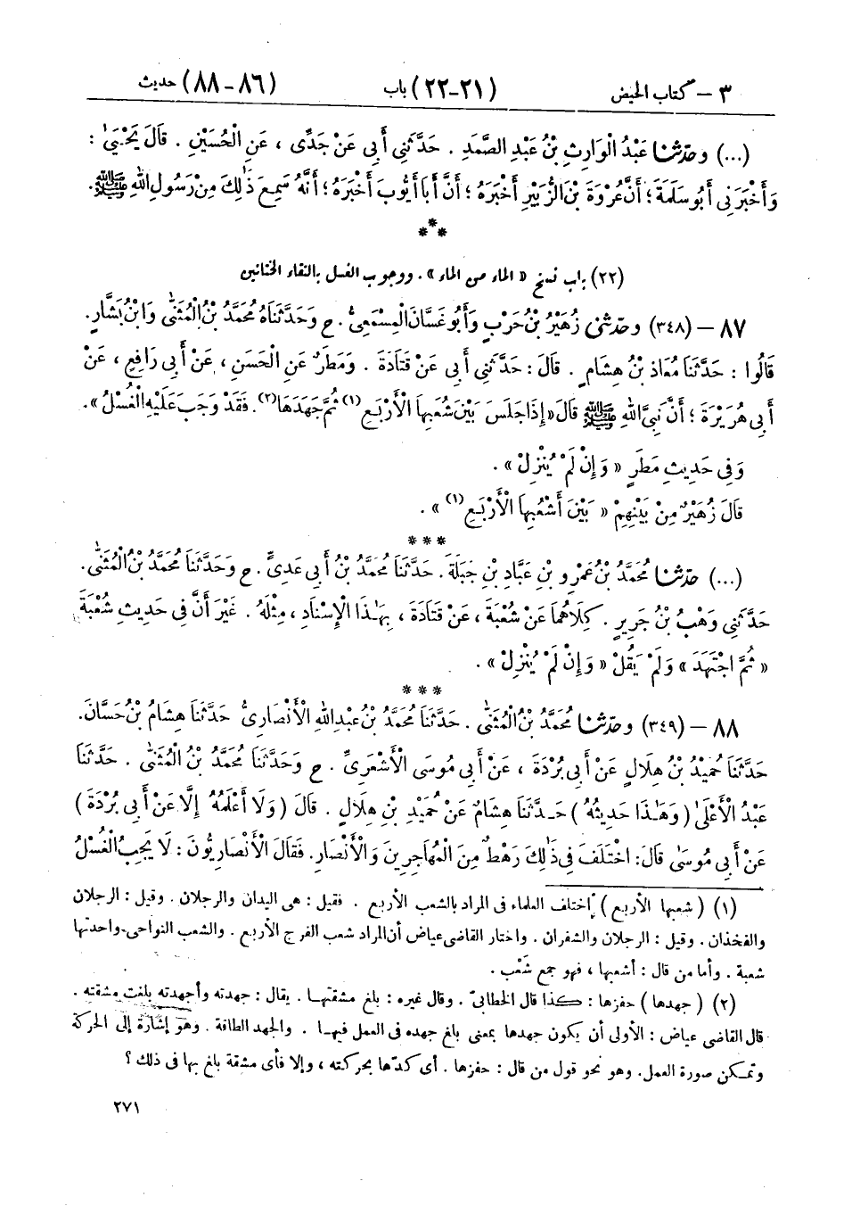 88 - (349) وَحَدَّثَنَا مُحَمَّدُ بْنُ الْمُثَنَّى، حَدَّثَنَا مُحَمَّدُ بْنُ عِبْدِ اللهِ الْأَنْصَارِيُّ، حَدَّثَنَا هِشَامُ بْنُ حَسَّانَ، حَدَّثَنَا حُمَيْدُ بْنُ هِلَالٍ، عَنْ أَبِي بُرْدَةَ، عَنْ أَبِي مُوسَى الْأَشْعَرِيِّ ح، وَحَدَّثَنَا مُحَمَّدُ بْنُ الْمُثَنَّى، حَدَّثَنَا عَبْدُ الْأَعْلَى، وَهَذَا حَدِيثُهُ حَدَّثَنَا هِشَامٌ، عَنْ حُمَيْدِ بْنِ هِلَالٍ، قَالَ: - وَلَا أَعْلَمُهُ إِلَّا عَنْ أَبِي بُرْدَةَ، عَنْ أَبِي مُوسَى، قَالَ: اخْتَلَفَ فِي ذَلِكَ رَهْطٌ مِنَ الْمُهَاجِرِينَ، وَالْأَنْصَارِ فَقَالَ الْأَنْصَارِيُّونَ: لَا يَجِبُ الْغُسْلُ إِلَّا مِنَ الدَّفْقِ أَوْ مِنَ الْمَاءِ. وَقَالَ الْمُهَاجِرُونَ: بَلْ إِذَا خَالَطَ فَقَدْ وَجَبَ الْغُسْلُ، قَالَ: قَالَ أَبُو مُوسَى: فَأَنَا أَشْفِيكُمْ مِنْ ذَلِكَ فَقُمْتُ فَاسْتَأْذَنْتُ عَلَى عَائِشَةَ فَأُذِنَ لِي، فَقُلْتُ لَهَا: يَا أُمَّاهْ - أَوْ يَا أُمَّ الْمُؤْمِنِينَ - إِنِّي أُرِيدُ أَنْ أَسْأَلَكِ عَنْ شَيْءٍ وَإِنِّي أَسْتَحْيِيكِ، فَقَالَتْ: لَا تَسْتَحْيِي أَنْ تَسْأَلَنِي عَمَّا كُنْتَ سَائِلًا عَنْهُ أُمَّكَ الَّتِي وَلَدَتْكَ، فَإِنَّمَا أَنَا أُمُّكَ، قُلْتُ: فَمَا يُوجِبُ الْغُسْلَ؟ قَالَتْ عَلَى الْخَبِيرِ سَقَطْتَ، قَالَ رَسُولُ اللهِ صَلَّى اللهُ عَلَيْهِ وَسَلَّمَ: «§إِذَا جَلَسَ بَيْنَ شُعَبِهَا الْأَرْبَعِ وَمَسَّ الْخِتَانُ الْخِتَانَ فَقَدْ وَجَبَ الْغُسْلُ»