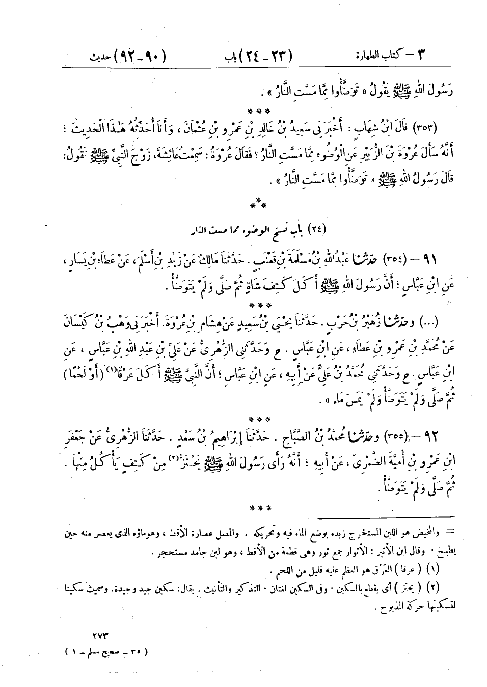 (354) وَحَدَّثَنَا زُهَيْرُ بْنُ حَرْبٍ، حَدَّثَنَا يَحْيَى بْنُ سَعِيدٍ، عَنْ هِشَامِ بْنِ عُرْوَةَ، أَخْبَرَنِي وَهْبُ بْنُ كَيْسَانَ، عَنْ مُحَمَّدِ بْنِ عَمْرِو بْنِ عَطَاءٍ، عَنِ ابْنِ عَبَّاسٍ، ح، وَحَدَّثَنِي الزُّهْرِيُّ، عَنْ عَلِيِّ بْنِ عَبْدِ اللهِ بْنِ عَبَّاسٍ، عَنِ ابْنِ عَبَّاسٍ، ح، وَحَدَّثَنِي مُحَمَّدُ بْنُ عَلِيٍّ، عَنْ أَبِيهِ، عَنِ ابْنِ عَبَّاسٍ: «أَنَّ النَّبِيَّ صَلَّى اللهُ عَلَيْهِ وَسَلَّمَ §أَكَلَ عَرْقًا، أَوْ لَحْمًا، ثُمَّ صَلَّى وَلَمْ يَتَوَضَّأْ، وَلَمْ يَمَسَّ مَاءً»