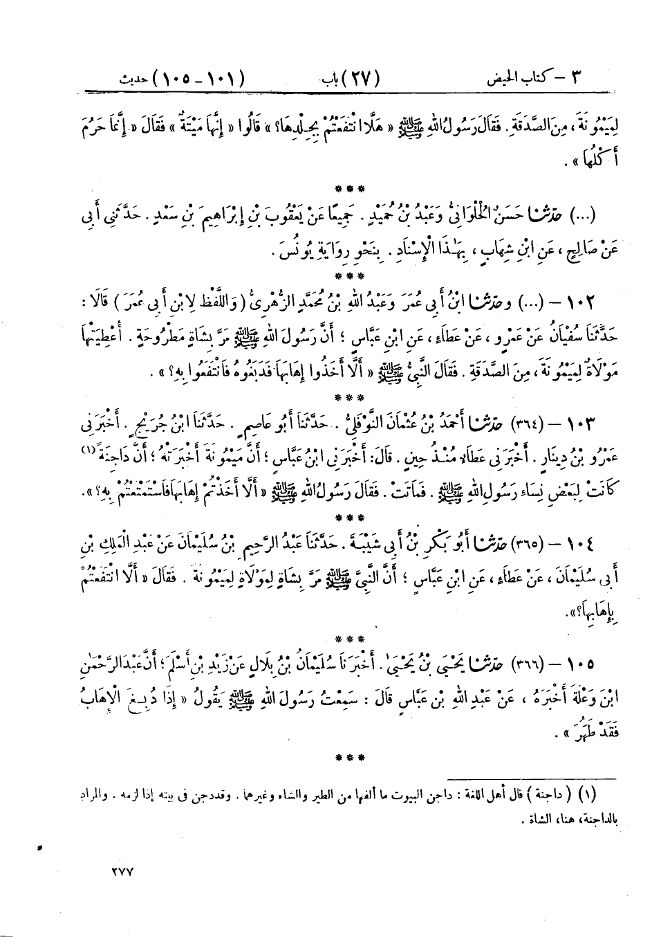103 - (364) حَدَّثَنَا أَحْمَدُ بْنُ عُثْمَانَ النَّوْفَلِيُّ، حَدَّثَنَا أَبُو عَاصِمٍ، حَدَّثَنَا ابْنُ جُرَيْجٍ، أَخْبَرَنِي عَمْرُو بْنُ دِينَارٍ، أَخْبَرَنِي عَطَاءٌ، مُنْذُ حِينٍ قَالَ: أَخْبَرَنِي ابْنُ عَبَّاسٍ، أَنَّ مَيْمُونَةَ، أَخْبَرَتْهُ أَنَّ دَاجِنَةً كَانَتْ لِبَعْضِ نِسَاءِ رَسُولِ اللهِ صَلَّى اللهُ عَلَيْهِ وَسَلَّمَ. فَمَاتَتْ. فَقَالَ رَسُولُ اللهِ صَلَّى اللهُ عَلَيْهِ وَسَلَّمَ: «§أَلَّا أَخَذْتُمْ إِهَابَهَا فَاسْتَمْتَعْتُمْ بِهِ؟»