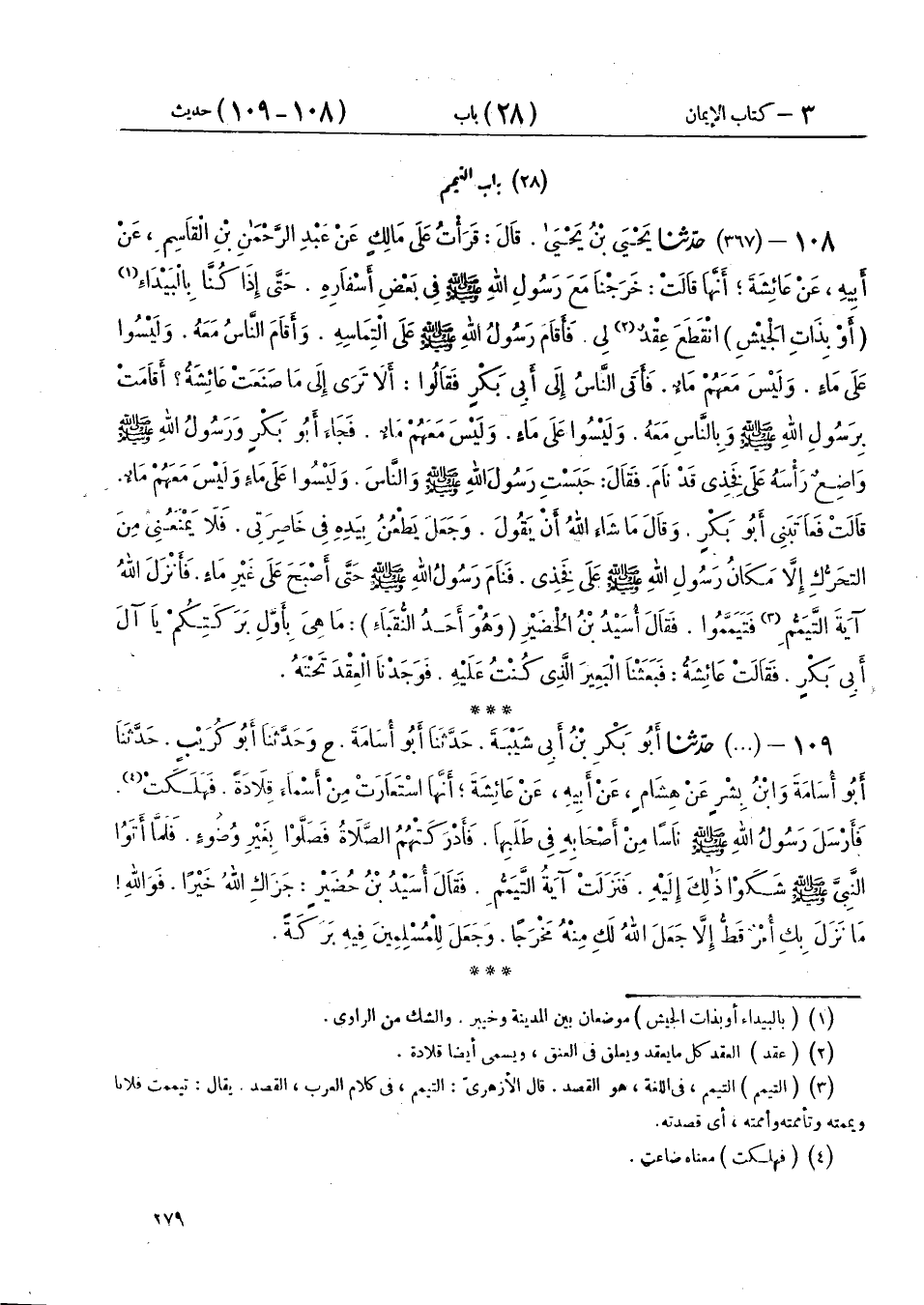 108 - (367) حَدَّثَنَا يَحْيَى بْنُ يَحْيَى، قَالَ: قَرَأْتُ عَلَى مَالِكٍ، عَنْ عَبْدِ الرَّحْمَنِ بْنِ الْقَاسِمِ، عَنْ أَبِيهِ، عَنْ عَائِشَةَ، أَنَّهَا قَالَتْ: خَرَجْنَا مَعَ رَسُولِ اللهِ صَلَّى اللهُ عَلَيْهِ وَسَلَّمَ فِي بَعْضِ أَسْفَارِهِ، حَتَّى إِذَا كُنَّا بِالْبَيْدَاءِ - أَوْ بِذَاتِ الْجَيْشِ - انْقَطَعَ عِقْدٌ لِي، «فَأَقَامَ رَسُولُ اللهِ صَلَّى اللهُ عَلَيْهِ وَسَلَّمَ عَلَى الْتِمَاسِهِ، وَأَقَامَ النَّاسُ مَعَهُ، وَلَيْسُوا عَلَى مَاءٍ، وَلَيْسَ مَعَهُمْ مَاءٌ»، فَأَتَى النَّاسُ إِلَى أَبِي بَكْرٍ فَقَالُوا: أَلَا تَرَى إِلَى مَا صَنَعَتْ عَائِشَةُ؟ «أَقَامَتْ بِرَسُولِ اللهِ صَلَّى اللهُ عَلَيْهِ وَسَلَّمَ وَبِالنَّاسِ مَعَهُ، وَلَيْسُوا عَلَى مَاءٍ، وَلَيْسَ مَعَهُمْ مَاءٌ»، فَجَاءَ أَبُو بَكْرٍ " وَرَسُولُ اللهِ صَلَّى اللهُ عَلَيْهِ وَسَلَّمَ وَاضِعٌ رَأْسَهُ عَلَى فَخِذِي قَدْ نَامَ، فَقَالَ: حَبَسْتِ رَسُولَ اللهِ صَلَّى اللهُ عَلَيْهِ وَسَلَّمَ وَالنَّاسَ وَلَيْسُوا عَلَى مَاءٍ، وَلَيْسَ مَعَهُمْ مَاءٌ «، قَالَتْ فَعَاتَبَنِي أَبُو بَكْرٍ، وَقَالَ مَا شَاءَ اللهُ أَنْ يَقُولَ، وَجَعَلَ يَطْعُنُ بِيَدِهِ فِي خَاصِرَتِي،» فَلَا يَمْنَعُنِي مِنَ التَّحَرُّكِ إِلَّا مَكَانُ رَسُولِ اللهِ صَلَّى اللهُ عَلَيْهِ وَسَلَّمَ عَلَى فَخِذِي، فَنَامَ رَسُولُ اللهِ صَلَّى اللهُ عَلَيْهِ وَسَلَّمَ §حَتَّى أَصْبَحَ عَلَى غَيْرِ مَاءٍ، فَأَنْزَلَ اللهُ آيَةَ التَّيَمُّمِ فَتَيَمَّمُوا " فَقَالَ أُسَيْدُ بْنُ الْحُضَيْرِ: - وَهُوَ أَحَدُ النُّقَبَاءِ - «مَا هِيَ بِأَوَّلِ بَرَكَتِكُمْ يَا آلَ أَبِي بَكْرٍ» فَقَالَتْ عَائِشَةُ: «فَبَعَثْنَا الْبَعِيرَ الَّذِي كُنْتُ عَلَيْهِ فَوَجَدْنَا الْعِقْدَ تَحْتَهُ»