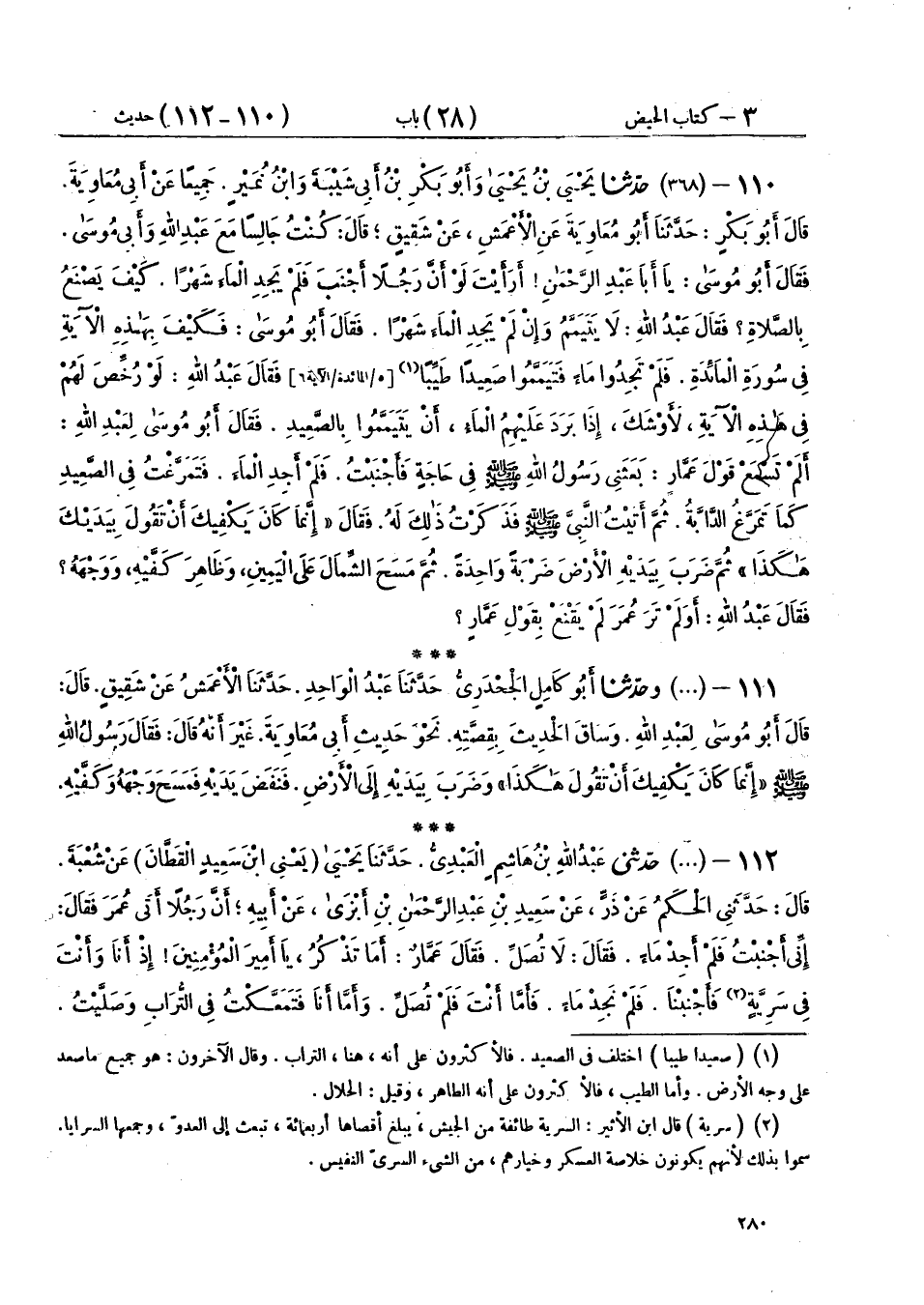 112 - (368) حَدَّثَنِي عَبْدُ اللهِ بْنُ هَاشِمٍ الْعَبْدِيُّ، حَدَّثَنَا يَحْيَى يَعْنِي ابْنَ سَعِيدٍ الْقَطَّانَ، عَنْ شُعْبَةَ، قَالَ: حَدَّثَنِي الْحَكَمُ، عَنْ ذَرٍّ، عَنْ سَعِيدِ بْنِ عَبْدِ الرَّحْمَنِ بْنِ أَبْزَى، عَنْ أَبِيهِ، أَنَّ رَجُلًا أَتَى عُمَرَ، فَقَالَ: إِنِّي أَجْنَبْتُ فَلَمْ أَجِدْ مَاءً فَقَالَ: لَا تُصَلِّ. فَقَالَ عَمَّارٌ: أَمَا تَذْكُرُ يَا أَمِيرَ الْمُؤْمِنِينَ، إِذْ أَنَا وَأَنْتَ فِي سَرِيَّةٍ فَأَجْنَبْنَا فَلَمْ نَجِدْ مَاءً، فَأَمَّا أَنْتَ فَلَمْ تُصَلِّ، وَأَمَّا أَنَا فَتَمَعَّكْتُ فِي التُّرَابِ وَصَلَّيْتُ، فَقَالَ النَّبِيُّ صَلَّى اللهُ عَلَيْهِ وَسَلَّمَ: «§إِنَّمَا كَانَ يَكْفِيكَ أَنْ تَضْرِبَ بِيَدَيْكَ الْأَرْضَ، ثُمَّ تَنْفُخَ، ثُمَّ تَمْسَحَ بِهِمَا وَجْهَكَ، وَكَفَّيْكَ» فَقَالَ عُمَرُ: " اتَّقِ اللهَ يَا عَمَّارُ قَالَ: إِنْ شِئْتَ لَمْ أُحَدِّثْ بِهِ " قَالَ الْحَكَمُ: وَحَدَّثَنِيهِ ابْنُ عَبْدِ الرَّحْمَنِ بْنُ أَبْزَى، عَنْ أَبِيهِ، مِثْلَ حَدِيثِ ذَرٍّ قَالَ: وَحَدَّثَنِي سَلَمَةُ، عَنْ ذَرٍّ، فِي هَذَا الْإِسْنَادِ الَّذِي ذَكَرَ الْحَكَمُ، فَقَالَ عُمَرُ: نُوَلِّيكَ مَا تَوَلَّيْتَ