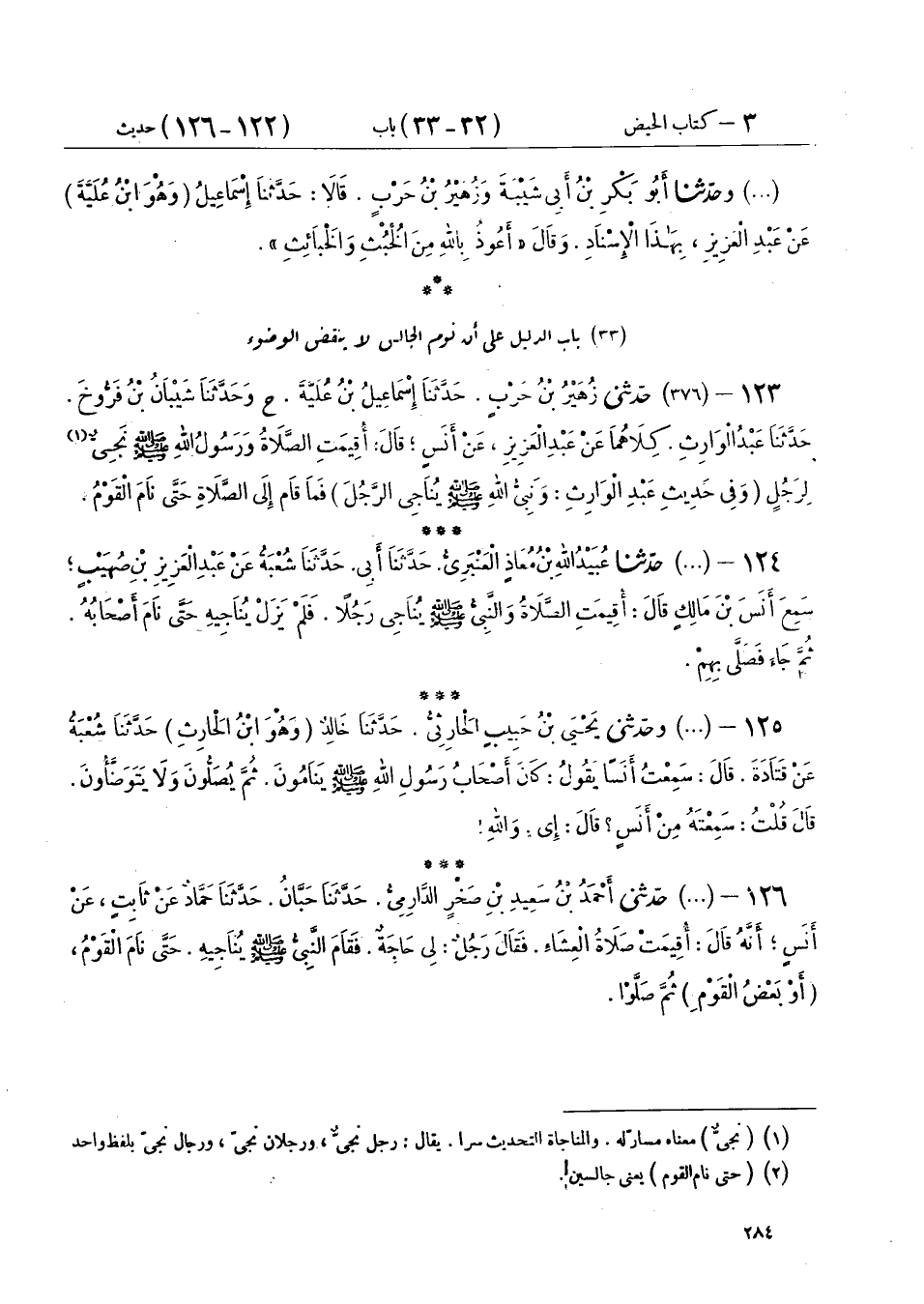 125 - (376) وَحَدَّثَنِي يَحْيَى بْنُ حَبِيبٍ الْحَارِثِيُّ، حَدَّثَنَا خَالِدٌ وَهُوَ ابْنُ الْحَارِثِ، حَدَّثَنَا شُعْبَةُ، عَنْ قَتَادَةَ، قَالَ: سَمِعْتُ أَنَسًا، يَقُولُ: «§كَانَ أَصْحَابُ رَسُولِ اللهِ صَلَّى اللهُ عَلَيْهِ وَسَلَّمَ يَنَامُونَ ثُمَّ يُصَلُّونَ وَلَا يَتَوَضَّئُونَ» قَالَ: قُلْتُ: سَمِعْتَهُ مِنْ أَنَسٍ قَالَ: إِي وَاللهِ