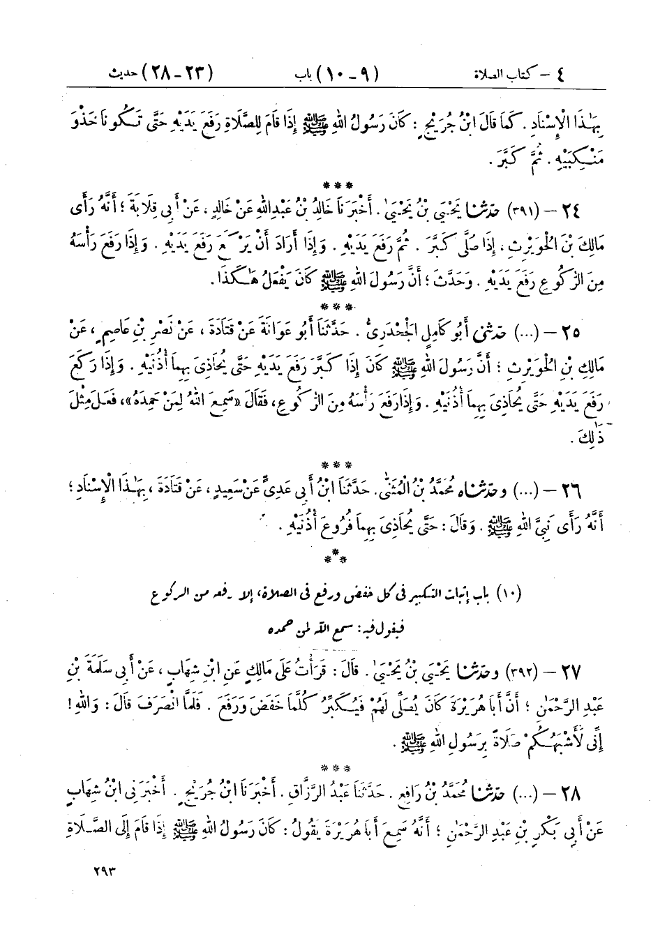 24 - (391) حَدَّثَنَا يَحْيَى بْنُ يَحْيَى، أَخْبَرَنَا خَالِدُ بْنُ عَبْدِ اللهِ، عَنْ خَالِدٍ، عَنْ أَبِي قِلَابَةَ، أَنَّهُ رَأَى مَالِكَ بْنَ الْحُوَيْرِثِ، «§إِذَا صَلَّى كَبَّرَ، ثُمَّ رَفَعَ يَدَيْهِ، وَإِذَا أَرَادَ أَنْ يَرْكَعَ رَفَعَ يَدَيْهِ، وَإِذَا رَفَعَ رَأْسَهُ مِنَ الرُّكُوعِ رَفَعَ يَدَيْهِ»، وَحَدَّثَ «أَنَّ رَسُولَ اللهِ صَلَّى اللهُ عَلَيْهِ وَسَلَّمَ كَانَ يَفْعَلُ هَكَذَا»