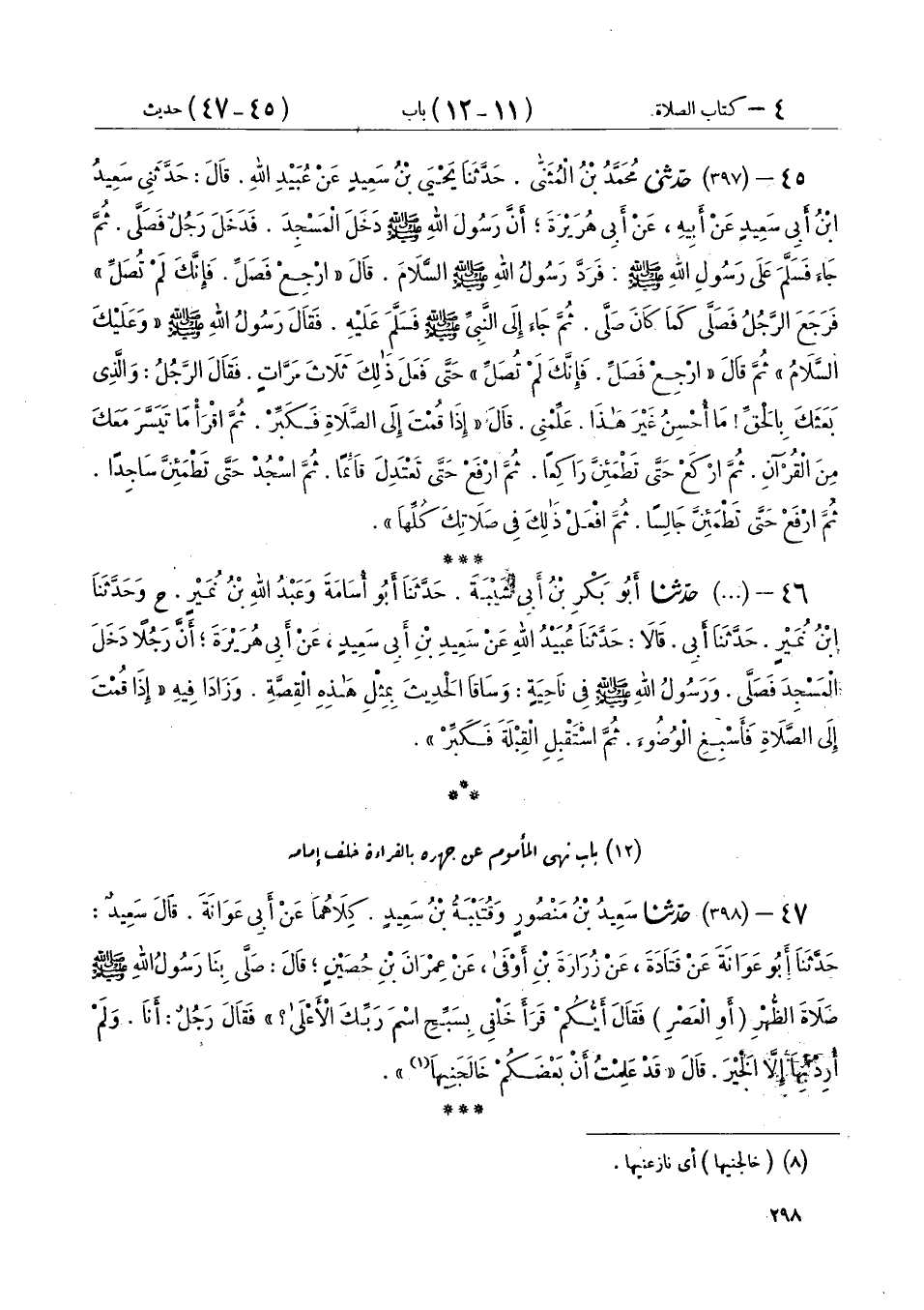 46 - (397) حَدَّثَنَا أَبُو بَكْرِ بْنُ أَبِي شَيْبَةَ، حَدَّثَنَا أَبُو أُسَامَةَ، وَعَبْدُ اللهِ بْنُ نُمَيْرٍ، ح وَحَدَّثَنَا ابْنُ نُمَيْرٍ، حَدَّثَنَا أَبِي، قَالَا: حَدَّثَنَا عُبَيْدُ اللهِ، عَنْ سَعِيدِ بْنِ أَبِي سَعِيدٍ، عَنْ أَبِي هُرَيْرَةَ، أَنَّ رَجُلًا دَخَلَ الْمَسْجِدَ فَصَلَّى وَرَسُولُ اللهِ صَلَّى اللهُ عَلَيْهِ وَسَلَّمَ فِي نَاحِيَةٍ، وَسَاقَا الْحَدِيثَ بِمِثْلِ هَذِهِ الْقِصَّةِ وَزَادَا فِيهِ «إِذَا قُمْتَ إِلَى الصَّلَاةِ فَأَسْبِغِ الْوُضُوءَ، ثُمَّ اسْتَقْبِلِ الْقِبْلَةَ فَكَبِّرْ»