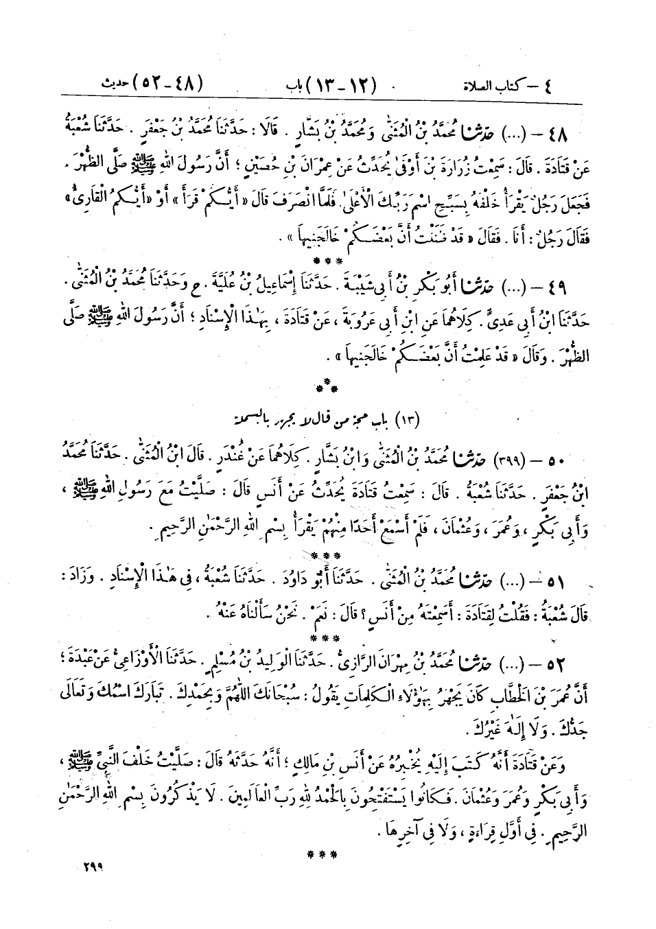 50 - (399) حَدَّثَنَا مُحَمَّدُ بْنُ الْمُثَنَّى، وَابْنُ بَشَّارٍ، كِلَاهُمَا عَنْ غُنْدَرٍ، قَالَ ابْنُ الْمُثَنَّى: حَدَّثَنَا مُحَمَّدُ بْنُ جَعْفَرٍ، حَدَّثَنَا شُعْبَةُ، قَالَ: سَمِعْتُ قَتَادَةَ، يُحَدِّثُ عَنْ أَنَسٍ، قَالَ: " صَلَّيْتُ مَعَ رَسُولِ اللهِ صَلَّى اللهُ عَلَيْهِ وَسَلَّمَ وَأَبِي بَكْرٍ، وَعُمَرَ، وَعُثْمَانَ، §فَلَمْ أَسْمَعْ أَحَدًا مِنْهُمْ يَقْرَأُ {بِسْمِ اللهِ الرَّحْمَنِ الرَّحِيمِ} [الفاتحة: 1] "