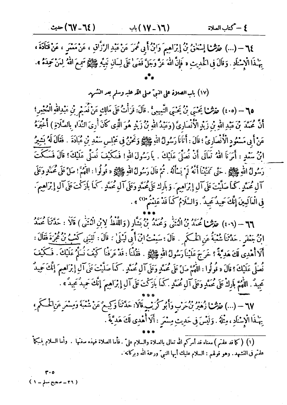 66 - (406) حَدَّثَنَا مُحَمَّدُ بْنُ الْمُثَنَّى، وَمُحَمَّدُ بْنُ بَشَّارٍ، - وَاللَّفْظُ لِابْنِ الْمُثَنَّى - قَالَا: حَدَّثَنَا مُحَمَّدُ بْنُ جَعْفَرٍ، حَدَّثَنَا شُعْبَةُ، عَنِ الْحَكَمِ، قَالَ: سَمِعْتُ ابْنَ أَبِي لَيْلَى، قَالَ: لَقِيَنِي كَعْبُ بْنُ عُجْرَةَ، فَقَالَ: أَلَا أُهْدِي لَكَ هَدِيَّةً خَرَجَ عَلَيْنَا رَسُولُ اللهِ صَلَّى اللهُ عَلَيْهِ وَسَلَّمَ فَقُلْنَا: قَدْ عَرَفْنَا كَيْفَ نُسَلِّمُ عَلَيْكَ فَكَيْفَ نُصَلِّي عَلَيْكَ؟ قَالَ: «§قُولُوا اللهُمَّ صَلِّ عَلَى مُحَمَّدٍ، وَعَلَى آلِ مُحَمَّدٍ، كَمَا صَلَّيْتَ عَلَى آلِ إِبْرَاهِيمَ، إِنَّكَ حَمِيدٌ مَجِيدٌ، اللهُمَّ بَارِكْ عَلَى مُحَمَّدٍ وَعَلَى آلِ مُحَمَّدٍ، كَمَا بَارَكْتَ عَلَى آلِ إِبْرَاهِيمَ، إِنَّكَ حَمِيدٌ مَجِيدٌ»