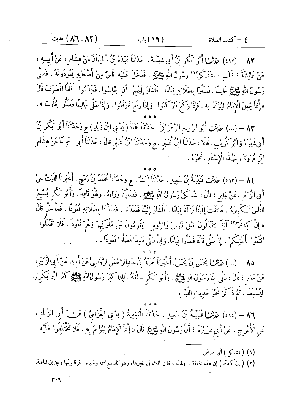 82 - (412) حَدَّثَنَا أَبُو بَكْرِ بْنُ أَبِي شَيْبَةَ، حَدَّثَنَا عَبْدَةُ بْنُ سُلَيْمَانَ، عَنْ هِشَامٍ، عَنْ أَبِيهِ، عَنْ عَائِشَةَ، قَالَتْ: " اشْتَكَى رَسُولُ اللهِ صَلَّى اللهُ عَلَيْهِ وَسَلَّمَ فَدَخَلَ عَلَيْهِ نَاسٌ مِنْ أَصْحَابِهِ يَعُودُونَهُ، فَصَلَّى رَسُولُ اللهِ صَلَّى اللهُ عَلَيْهِ وَسَلَّمَ جَالِسًا، فَصَلَّوْا بِصَلَاتِهِ قِيَامًا فَأَشَارَ إِلَيْهِمْ: أَنِ اجْلِسُوا فَجَلَسُوا " فَلَمَّا انْصَرَفَ قَالَ: «§إِنَّمَا جُعِلَ الْإِمَامُ لِيُؤتَمَّ بِهِ فَإِذَا رَكَعَ فَارْكَعُوا وَإِذَا رَفَعَ فَارْفَعُوا وَإِذَا صَلَّى جَالِسًا فَصَلُّوا جُلُوسًا»