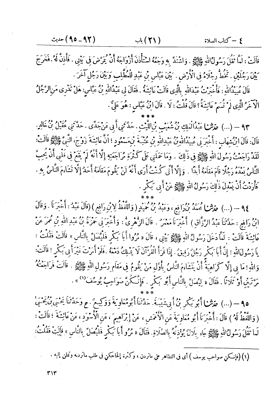 95 - (418) حَدَّثَنَا أَبُو بَكْرِ بْنُ أَبِي شَيْبَةَ، حَدَّثَنَا أَبُو مُعَاوِيَةَ، وَوَكِيعٌ، ح وَحَدَّثَنَا يَحْيَى بْنُ يَحْيَى، - وَاللَّفْظُ لَهُ - قَالَ: أَخْبَرَنَا أَبُو مُعَاوِيَةَ، عَنِ الْأَعْمَشِ، عَنْ إِبْرَاهِيمَ، عَنِ الْأَسْوَدِ، عَنْ عَائِشَةَ، قَالَتْ: لَمَّا ثَقُلَ رَسُولُ اللهِ صَلَّى اللهُ عَلَيْهِ وَسَلَّمَ جَاءَ بِلَالٌ يُؤْذِنُهُ بِالصَّلَاةِ. فَقَالَ: «مُرُوا أَبَا بَكْرٍ فَلْيُصَلِّ بِالنَّاسِ» قَالَتْ: فَقُلْتُ يَا رَسُولَ اللهِ، إِنَّ أَبَا بَكْرٍ رَجُلٌ أَسِيفٌ وَإِنَّهُ مَتَى يَقُمْ مَقَامَكَ لَا يُسْمِعِ النَّاسَ فَلَوْ أَمَرْتَ عُمَرَ، فَقَالَ: «مُرُوا أَبَا بَكْرٍ فَلْيُصَلِّ بِالنَّاسِ» قَالَتْ: فَقُلْتُ لِحَفْصَةَ قُولِي لَهُ: إِنَّ أَبَا بَكْرٍ رَجُلٌ أَسِيفٌ وَإِنَّهُ مَتَى يَقُمْ مَقَامَكَ لَا يُسْمِعِ النَّاسَ، فَلَوْ أَمَرْتَ عُمَرَ، فَقَالَتْ لَهُ: فَقَالَ رَسُولُ اللهِ صَلَّى اللهُ عَلَيْهِ وَسَلَّمَ: «§إِنَّكُنَّ لَأَنْتُنَّ صَوَاحِبُ يُوسُفَ» مُرُوا أَبَا بَكْرٍ فَلْيُصَلِّ بِالنَّاسِ، قَالَتْ: فَأَمَرُوا أَبَا بَكْرٍ يُصَلِّي بِالنَّاسِ، قَالَتْ: فَلَمَّا دَخَلَ فِي الصَّلَاةِ وَجَدَ رَسُولُ اللهِ صَلَّى اللهُ عَلَيْهِ وَسَلَّمَ مِنْ نَفْسِهِ خِفَّةً فَقَامَ يُهَادَى بَيْنَ رَجُلَيْنِ، وَرِجْلَاهُ تَخُطَّانِ فِي الْأَرْضِ، قَالَتْ: فَلَمَّا دَخَلَ الْمَسْجِدَ سَمِعَ أَبُو بَكْرٍ حِسَّهُ، ذَهَبَ يَتَأَخَّرُ، فَأَوْمَأَ إِلَيْهِ رَسُولُ اللهِ صَلَّى اللهُ عَلَيْهِ وَسَلَّمَ، قُمْ مَكَانَكَ، فَجَاءَ رَسُولُ اللهِ صَلَّى اللهُ عَلَيْهِ وَسَلَّمَ حَتَّى جَلَسَ عَنْ يَسَارِ أَبِي بَكْرٍ قَالَتْ: فَكَانَ رَسُولُ اللهِ صَلَّى اللهُ عَلَيْهِ وَسَلَّمَ يُصَلِّي بِالنَّاسِ جَالِسًا وَأَبُو بَكْرٍ قَائِمًا يَقْتَدِي أَبُو بَكْرٍ بِصَلَاةِ النَّبِيِّ صَلَّى اللهُ عَلَيْهِ وَسَلَّمَ وَيَقْتَدِي النَّاسُ بِصَلَاةِ أَبِي بَكْرٍ