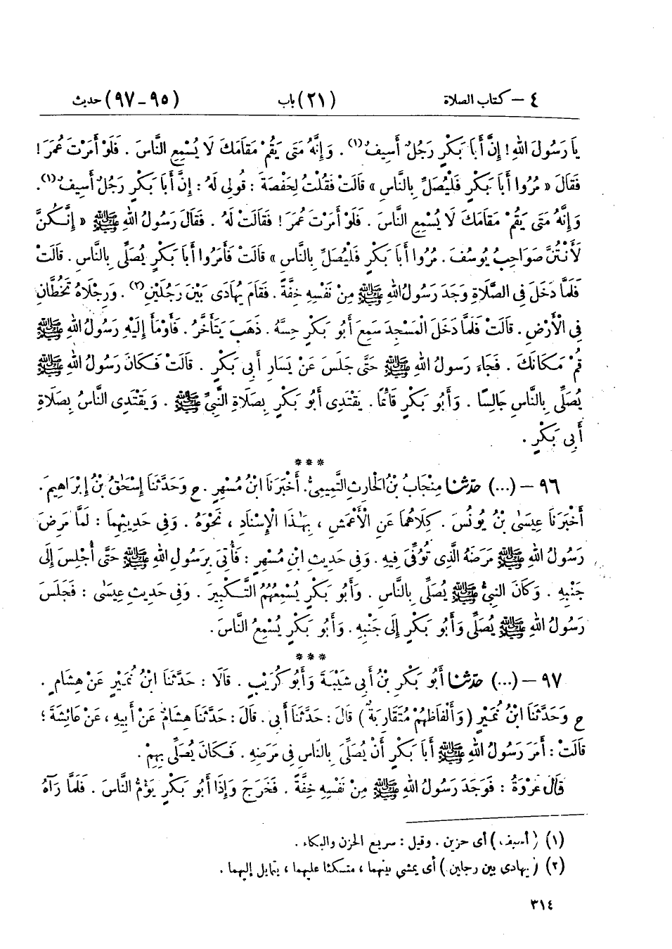 97 - (418) حَدَّثَنَا أَبُو بَكْرِ بْنُ أَبِي شَيْبَةَ، وَأَبُو كُرَيْبٍ، قَالَا: حَدَّثَنَا ابْنُ نُمَيْرٍ، عَنْ هِشَامٍ، ح وحَدَّثَنَا ابْنُ نُمَيْرٍ، - وَأَلْفَاظُهُمْ مُتَقَارِبَةٌ - قَالَ: حَدَّثَنَا أَبِي، قَالَ: حَدَّثَنَا هِشَامٌ، عَنْ أَبِيهِ، عَنْ عَائِشَةَ، قَالَتْ: «§أَمَرَ رَسُولُ اللهِ صَلَّى اللهُ عَلَيْهِ وَسَلَّمَ أَبَا بَكْرٍ أَنْ يُصَلِّيَ بِالنَّاسِ فِي مَرَضِهِ فَكَانَ يُصَلِّي بِهِمْ» قَالَ عُرْوَةُ: «فَوَجَدَ رَسُولُ اللهِ صَلَّى اللهُ عَلَيْهِ وَسَلَّمَ مِنْ نَفْسِهِ خِفَّةً فَخَرَجَ وَإِذَا أَبُو بَكْرٍ يَؤُمُّ النَّاسَ فَلَمَّا رَآهُ أَبُو بَكْرٍ اسْتَأْخَرَ، فَأَشَارَ إِلَيْهِ رَسُولُ اللهِ صَلَّى اللهُ عَلَيْهِ وَسَلَّمَ أَيْ كَمَا أَنْتَ فَجَلَسَ رَسُولُ اللهِ صَلَّى اللهُ عَلَيْهِ وَسَلَّمَ حِذَاءَ أَبِي بَكْرٍ إِلَى جَنْبِهِ فَكَانَ أَبُو بَكْرٍ يُصَلِّي بِصَلَاةِ رَسُولِ اللهِ صَلَّى اللهُ عَلَيْهِ وَسَلَّمَ وَالنَّاسُ يُصَلُّونَ بِصَلَاةِ أَبِي بَكْرٍ»