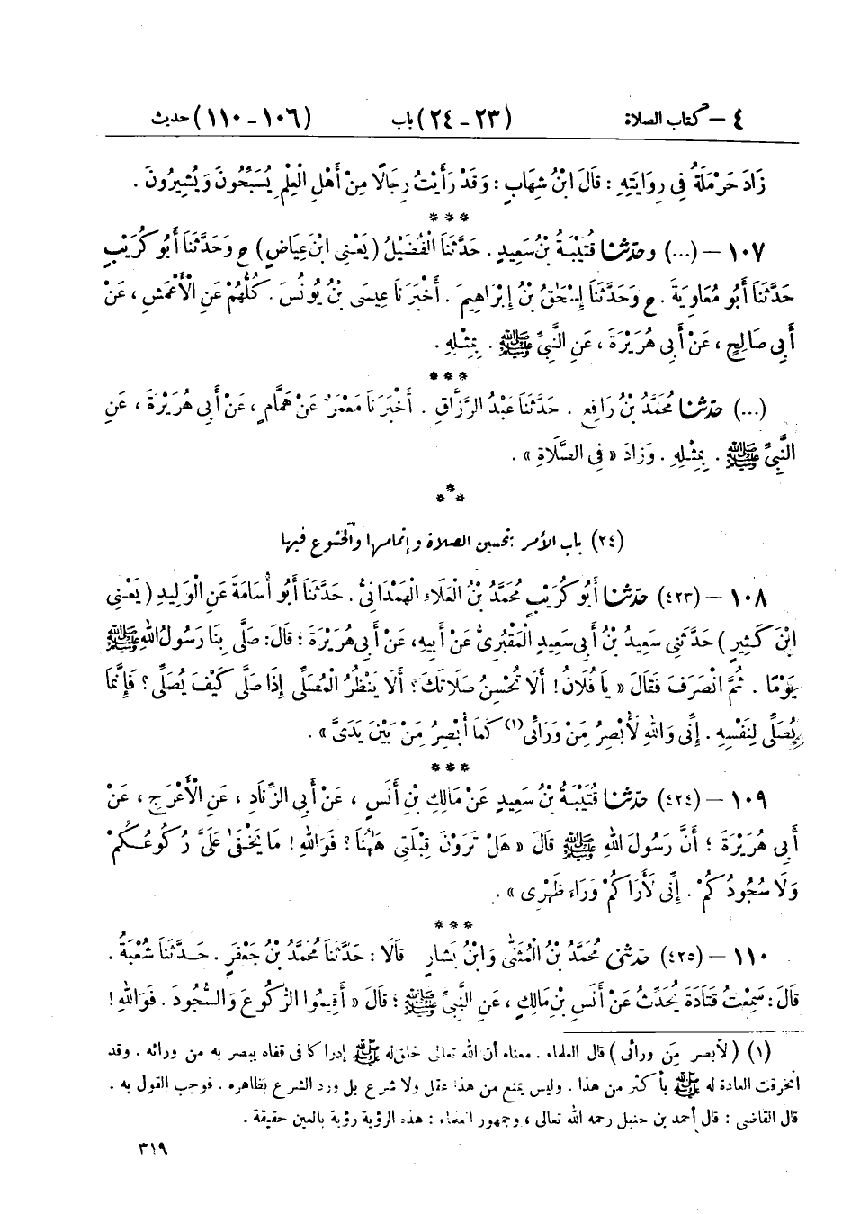 109 - (424) حَدَّثَنَا قُتَيْبَةُ بْنُ سَعِيدٍ، عَنْ مَالِكِ بْنِ أَنَسٍ، عَنْ أَبِي الزِّنَادِ، عَنِ الْأَعْرَجِ، عَنْ أَبِي هُرَيْرَةَ، أَنَّ رَسُولَ اللهِ صَلَّى اللهُ عَلَيْهِ وَسَلَّمَ قَالَ: «§هَلْ تَرَوْنَ قِبْلَتِي هَا هُنَا؟ فَوَاللهِ مَا يَخْفَى عَلَيَّ رُكُوعُكُمْ، وَلَا سُجُودُكُمْ إِنِّي لَأَرَاكُمْ وَرَاءَ ظَهْرِي»