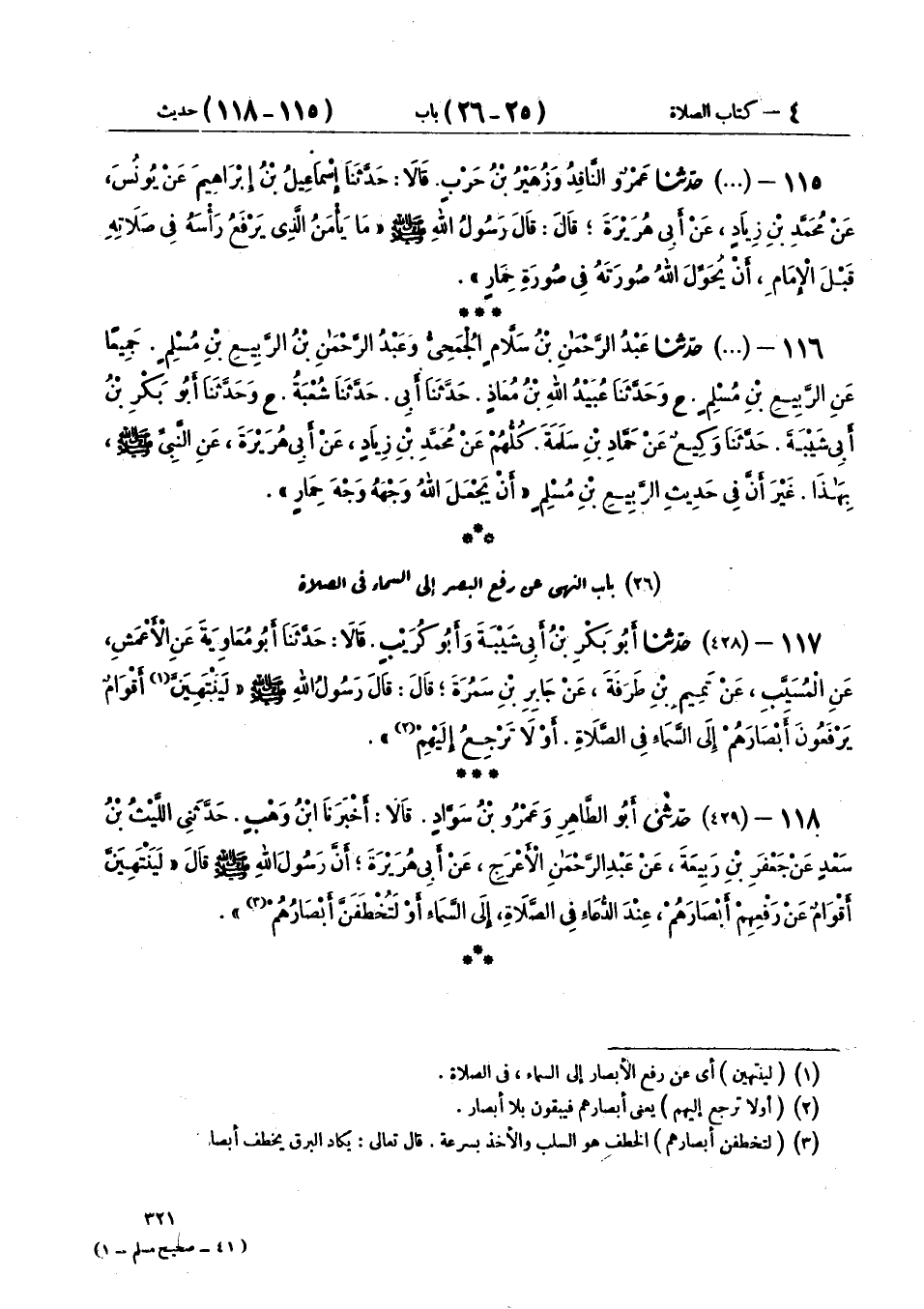 118 - (429) حَدَّثَنِي أَبُو الطَّاهِرِ، وَعَمْرُو بْنُ سَوَّادٍ، قَالَا: أَخْبَرَنَا ابْنُ وَهْبٍ، حَدَّثَنِي اللَّيْثُ بْنُ سَعْدٍ، عَنْ جَعْفَرِ بْنِ رَبِيعَةَ، عَنْ عَبْدِ الرَّحْمَنِ الْأَعْرَجِ، عَنْ أَبِي هُرَيْرَةَ، أَنَّ رَسُولَ اللهِ صَلَّى اللهُ عَلَيْهِ وَسَلَّمَ قَالَ: «§لَيَنْتَهِيَنَّ أَقْوَامٌ عَنْ رَفْعِهِمْ أَبْصَارَهُمْ عِنْدَ الدُّعَاءِ فِي الصَّلَاةِ إِلَى السَّمَاءِ، أَوْ لَتُخْطَفَنَّ أَبْصَارُهُمْ»