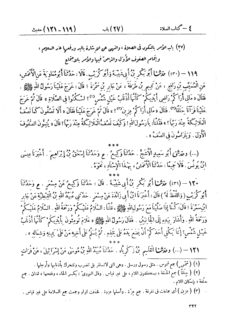 119 - (430) حَدَّثَنَا أَبُو بَكْرِ بْنُ أَبِي شَيْبَةَ، وَأَبُو كُرَيْبٍ، قَالَا: حَدَّثَنَا أَبُو مُعَاوِيَةَ، عَنِ الْأَعْمَشِ، عَنِ الْمُسَيَّبِ بْنِ رَافِعٍ، عَنْ تَمِيمِ بْنِ طَرَفَةَ، عَنْ جَابِرِ بْنِ سَمُرَةَ، قَالَ: خَرَجَ عَلَيْنَا رَسُولُ اللهِ صَلَّى اللهُ عَلَيْهِ وَسَلَّمَ فَقَالَ: «§مَا لِي أَرَاكُمْ رَافِعِي أَيْدِيكُمْ كَأَنَّهَا أَذْنَابُ خَيْلٍ شُمْسٍ؟ اسْكُنُوا فِي الصَّلَاةِ» قَالَ: ثُمَّ خَرَجَ عَلَيْنَا فَرَآنَا حَلَقًا فَقَالَ: «مَالِي أَرَاكُمْ عِزِينَ» قَالَ: ثُمَّ خَرَجَ عَلَيْنَا فَقَالَ: «أَلَا تَصُفُّونَ كَمَا تَصُفُّ الْمَلَائِكَةُ عِنْدَ رَبِّهَا؟» فَقُلْنَا يَا رَسُولَ اللهِ، وَكَيْفَ تَصُفُّ الْمَلَائِكَةُ عِنْدَ رَبِّهَا؟ قَالَ: «يُتِمُّونَ الصُّفُوفَ الْأُوَلَ وَيَتَرَاصُّونَ فِي الصَّفِّ»