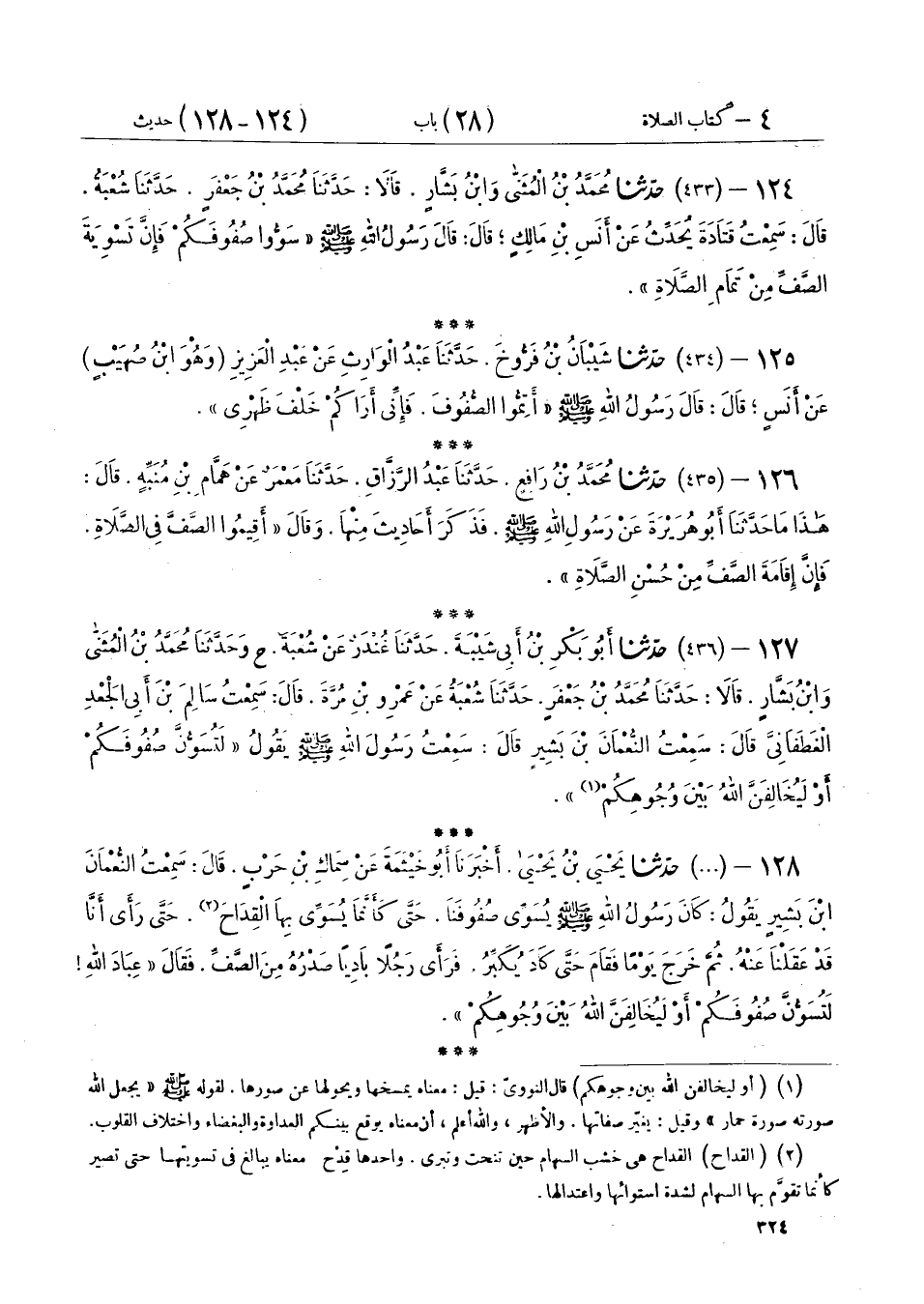 124 - (433) حَدَّثَنَا مُحَمَّدُ بْنُ الْمُثَنَّى، وَابْنُ بَشَّارٍ، قَالَا: حَدَّثَنَا مُحَمَّدُ بْنُ جَعْفَرٍ، حَدَّثَنَا شُعْبَةُ، قَالَ: سَمِعْتُ قَتَادَةَ، يُحَدِّثُ عَنْ أَنَسِ بْنِ مَالِكٍ، قَالَ: قَالَ رَسُولُ اللهِ صَلَّى اللهُ عَلَيْهِ وَسَلَّمَ: «§سَوُّوا صُفُوفَكُمْ، فَإِنَّ تَسْوِيَةَ الصَّفِّ، مِنْ تَمَامِ الصَّلَاةِ»