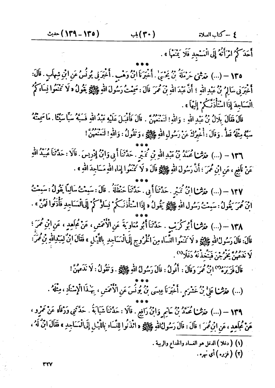 136 - (442) حَدَّثَنَا مُحَمَّدُ بْنُ عَبْدِ اللهِ بْنِ نُمَيْرٍ، حَدَّثَنَا أَبِي، وَابْنُ إِدْرِيسَ، قَالَا: حَدَّثَنَا عُبَيْدُ اللهِ، عَنْ نَافِعٍ، عَنِ ابْنِ عُمَرَ، أَنَّ رَسُولَ اللهِ صَلَّى اللهُ عَلَيْهِ وَسَلَّمَ قَالَ: «§لَا تَمْنَعُوا إِمَاءَ اللهِ مَسَاجِدَ اللهِ»