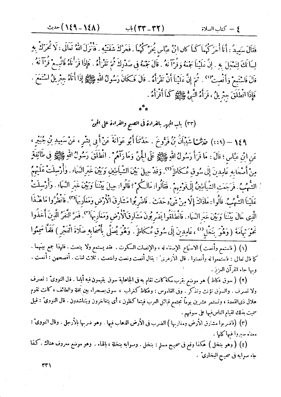 149 - (449) حَدَّثَنَا شَيْبَانُ بْنُ فَرُّوخَ، حَدَّثَنَا أَبُو عَوَانَةَ، عَنْ أَبِي بِشْرٍ، عَنْ سَعِيدِ بْنِ جُبَيْرٍ، عَنِ ابْنِ عَبَّاسٍ قَالَ: مَا قَرَأَ رَسُولُ اللهِ صَلَّى اللهُ عَلَيْهِ وَسَلَّمَ عَلَى الْجِنِّ وَمَا رَآهُمُ انْطَلَقَ رَسُولُ اللهِ صَلَّى اللهُ عَلَيْهِ وَسَلَّمَ فِي طَائِفَةٍ مِنْ أَصْحَابِهِ عَامِدِينَ إِلَى سُوقِ عُكَاظٍ وَقَدْ حِيلَ بَيْنَ الشَّيَاطِينِ وَبَيْنَ خَبَرِ السَّمَاءِ. وَأُرْسِلَتْ عَلَيْهِمُ الشُّهُبُ. فَرَجَعَتِ الشَّيَاطِينُ إِلَى قَوْمِهِمْ فَقَالُوا: مَا لَكُمْ. قَالُوا: حِيلَ بَيْنَنَا وَبَيْنَ خَبَرِ السَّمَاءِ وَأُرْسِلَتْ عَلَيْنَا الشُّهُبُ. قَالُوا: مَا ذَاكَ إِلَّا مِنْ شَيْءٍ حَدَثَ. فَاضْرِبُوا مَشَارِقَ الْأَرْضِ وَمَغَارِبَهَا. فَانْظُرُوا مَا هَذَا الَّذِي حَالَ بَيْنَنَا وَبَيْنَ خَبَرِ السَّمَاءِ فَانْطَلَقُوا يَضْرِبُونَ مَشَارِقَ الْأَرْضِ وَمَغَارِبَهَا. فَمَرَّ النَّفَرُ الَّذِينَ أَخَذُوا نَحْوَ تِهَامَةَ - وَهُوَ بِنَخْلٍ عَامِدِينَ إِلَى سُوقِ عُكَاظٍ وَهُوَ يُصَلِّي بِأَصْحَابِهِ صَلَاةَ الْفَجْرِ - فَلَمَّا سَمِعُوا الْقُرْآنَ اسْتَمَعُوا لَهُ. وَقَالُوا: هَذَا الَّذِي حَالَ بَيْنَنَا وَبَيْنَ خَبَرِ السَّمَاءِ فَرَجَعُوا إِلَى قَوْمِهِمْ. فَقَالُوا: يَا قَوْمَنَا إِنَّا سَمِعْنَا قُرْآنًا عَجَبًا يَهْدِي إِلَى الرُّشْدِ فَآمَنَّا بِهِ وَلَنْ نُشْرِكَ بِرَبِّنَا أَحَدًا. فَأَنْزَلَ اللهُ عَزَّ وَجَلَّ عَلَى نَبِيِّهِ مُحَمَّدٍ صَلَّى اللهُ عَلَيْهِ وَسَلَّمَ: «§قُلْ أُوحِيَ إِلَيَّ أَنَّهُ اسْتَمَعَ نَفَرٌ مِنَ الْجِنِّ»