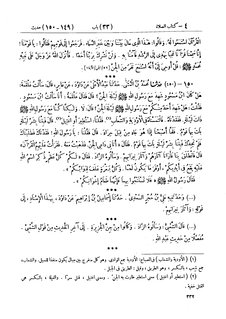 150 - (450) حَدَّثَنَا مُحَمَّدُ بْنُ الْمُثَنَّى، حَدَّثَنَا عَبْدُ الْأَعْلَى عَنْ دَاوُدَ، عَنْ عَامِرٍ، قَالَ: سَأَلْتُ عَلْقَمَةَ هَلْ كَانَ ابْنُ مَسْعُودٍ شَهِدَ مَعَ رَسُولِ اللهِ صَلَّى اللهُ عَلَيْهِ وَسَلَّمَ لَيْلَةَ الْجِنِّ؟ قَالَ: فَقَالَ عَلْقَمَةُ، أَنَا سَأَلْتُ ابْنَ مَسْعُودٍ فَقُلْتُ: هَلْ شَهِدَ أَحَدٌ مِنْكُمْ مَعَ رَسُولِ اللهِ صَلَّى اللهُ عَلَيْهِ وَسَلَّمَ لَيْلَةَ الْجِنِّ؟ قَالَ: لَا وَلَكِنَّا كُنَّا مَعَ رَسُولِ اللهِ ذَاتَ لَيْلَةٍ فَفَقَدْنَاهُ فَالْتَمَسْنَاهُ فِي الْأَوْدِيَةِ وَالشِّعَابِ. فَقُلْنَا: اسْتُطِيرَ أَوِ اغْتِيلَ. قَالَ: فَبِتْنَا بِشَرِّ لَيْلَةٍ بَاتَ بِهَا قَوْمٌ فَلَمَّا أَصْبَحْنَا إِذَا هُوَ جَاءٍ مِنْ قِبَلَ حِرَاءٍ. قَالَ: فَقُلْنَا يَا رَسُولَ اللهِ فَقَدْنَاكَ فَطَلَبْنَاكَ فَلَمْ نَجِدْكَ فَبِتْنَا بِشَرِّ لَيْلَةٍ بَاتَ بِهَا قَوْمٌ. فَقَالَ: «§أَتَانِي دَاعِي الْجِنِّ فَذَهَبْتُ مَعَهُ فَقَرَأْتُ عَلَيْهِمُ الْقُرْآنَ» قَالَ: فَانْطَلَقَ بِنَا فَأَرَانَا آثَارَهُمْ وَآثَارَ نِيرَانِهِمْ وَسَأَلُوهُ الزَّادَ فَقَالَ: " لَكُمْ كُلُّ عَظْمٍ ذُكِرَ اسْمُ اللهِ عَلَيْهِ يَقَعُ فِي أَيْدِيكُمْ أَوْفَرَ مَا يَكُونُ لَحْمًا وَكُلُّ بَعْرَةٍ عَلَفٌ لِدَوَابِّكُمْ. فَقَالَ رَسُولُ اللهِ صَلَّى اللهُ عَلَيْهِ وَسَلَّمَ: «فَلَا تَسْتَنْجُوا بِهِمَا فَإِنَّهُمَا طَعَامُ إِخْوَانِكُمْ»