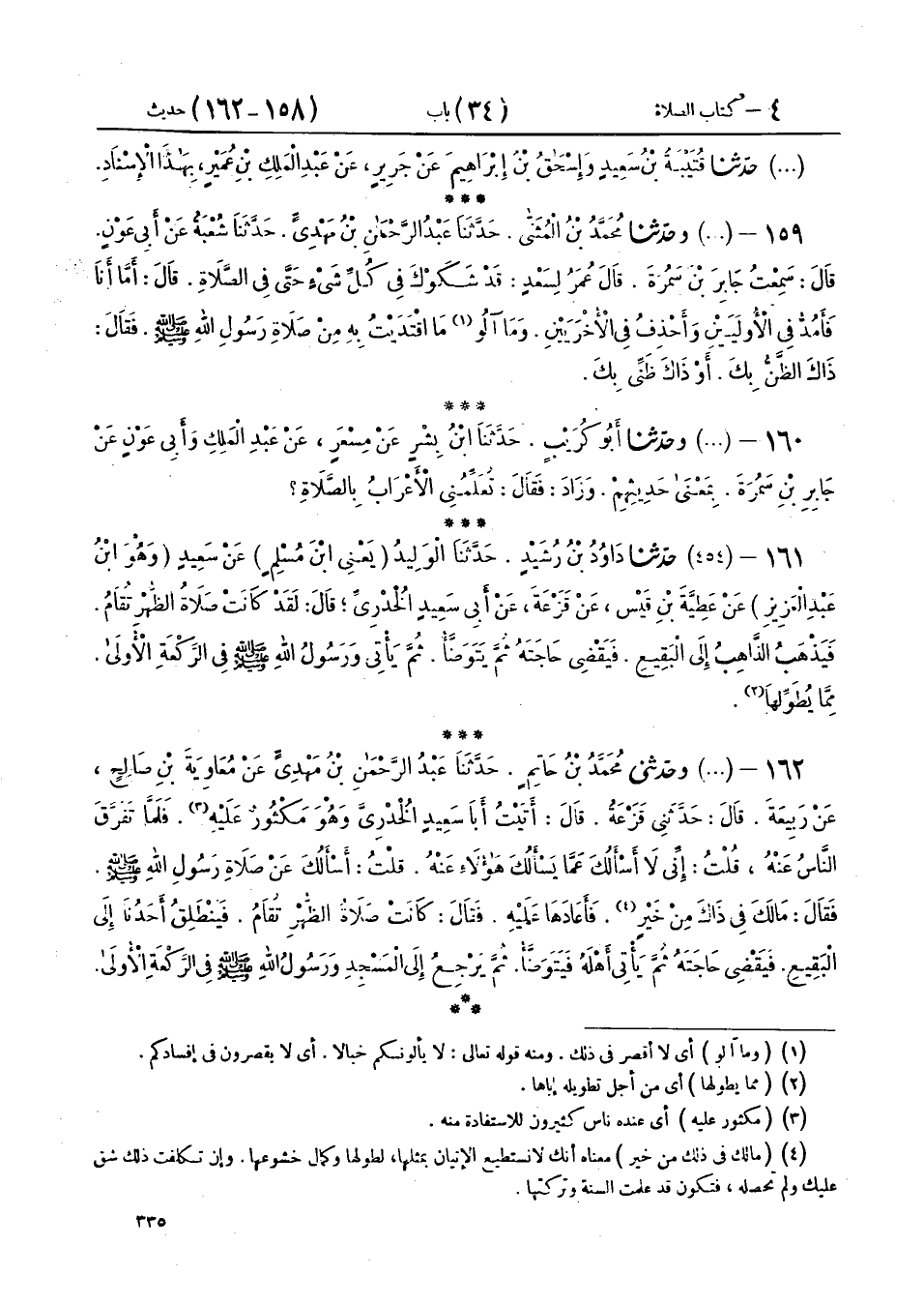 162 - (454) وَحَدَّثَنِي مُحَمَّدُ بْنُ حَاتِمٍ، حَدَّثَنَا عَبْدُ الرَّحْمَنِ بْنُ مَهْدِيٍّ، عَنْ مُعَاوِيَةَ بْنِ صَالِحٍ، عَنْ رَبِيعَةَ، قَالَ: حَدَّثَنِي قَزْعَةُ، قَالَ: أَتَيْتُ أَبَا سَعِيدٍ الْخُدْرِيَّ، وَهُوَ مَكْثُورٌ عَلَيْهِ فَلَمَّا تَفَرَّقَ النَّاسُ عَنْهُ قُلْتُ: إِنِّي لَا أَسْأَلُكَ عَمَّا يَسْأَلُكَ هَؤُلَاءِ عَنْهُ قُلْتُ: أَسْأَلُكَ عَنْ صَلَاةِ رَسُولِ اللهِ صَلَّى اللهُ عَلَيْهِ وَسَلَّمَ فَقَالَ: مَا لَكَ فِي ذَاكَ مِنْ خَيْرٍ فَأَعَادَهَا عَلَيْهِ. فَقَالَ: «§كَانَتْ صَلَاةُ الظُّهْرِ تُقَامُ فَيَنْطَلِقُ أَحَدُنَا إِلَى الْبَقِيعِ فَيَقْضِي حَاجَتَهُ، ثُمَّ يَأْتِي أَهْلَهُ فَيَتَوَضَّأُ، ثُمَّ يَرْجِعُ إِلَى الْمَسْجِدِ وَرَسُولُ اللهِ صَلَّى اللهُ عَلَيْهِ وَسَلَّمَ فِي الرَّكْعَةِ الْأُولَى»