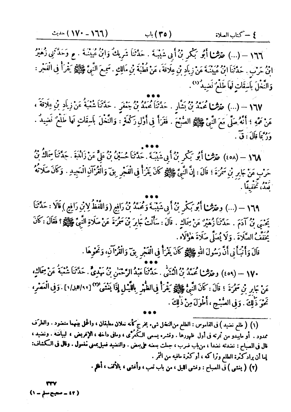 169 - (458) وَحَدَّثَنَا أَبُو بَكْرِ بْنُ أَبِي شَيْبَةَ، وَمُحَمَّدُ بْنُ رَافِعٍ، وَاللَّفْظُ لِابْنِ رَافِعٍ، قَالَا: حَدَّثَنَا يَحْيَى بْنُ آدَمَ، حَدَّثَنَا زُهَيْرٌ، عَنْ سِمَاكٍ قَالَ: سَأَلْتُ جَابِرَ بْنَ سَمُرَةَ، عَنْ صَلَاةِ النَّبِيِّ صَلَّى اللهُ عَلَيْهِ وَسَلَّمَ فَقَالَ: §كَانَ يُخَفِّفُ الصَّلَاةَ وَلَا يُصَلِّي صَلَاةَ هَؤُلَاءِ. قَالَ: وَأَنْبَأَنِي: أَنَّ رَسُولَ اللهِ صَلَّى اللهُ عَلَيْهِ وَسَلَّمَ كَانَ يَقْرَأُ فِي الْفَجْرِ بِـ ق وَالْقُرْآنِ وَنَحْوِهَا
