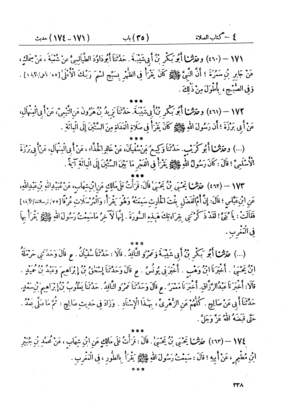 174 - (463) حَدَّثَنَا يَحْيَى بْنُ يَحْيَى، قَالَ: قَرَأْتُ عَلَى مَالِكٍ، عَنِ ابْنِ شِهَابٍ، عَنْ مُحمَّدِ بْنِ جُبَيْرِ بْنِ مُطْعِمٍ، عَنْ أَبِيهِ قَالَ: سَمِعْتُ رَسُولَ اللهِ صَلَّى اللهُ عَلَيْهِ وَسَلَّمَ §يَقْرَأُ بِالطُّورِ فِي الْمَغْرِبِ