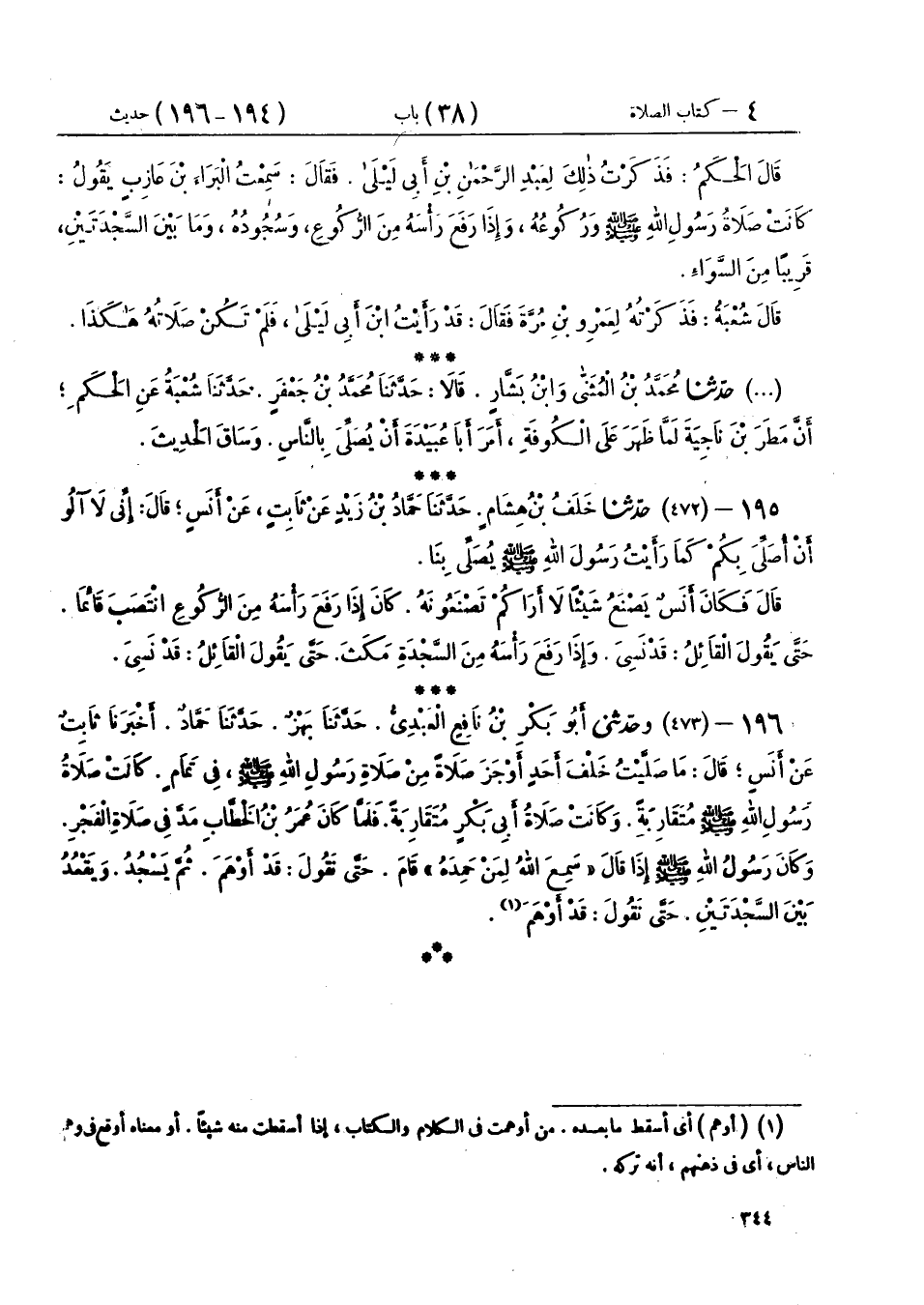 195 - (472) حَدَّثَنَا خَلَفُ بْنُ هِشَامٍ، حَدَّثَنَا حَمَّادُ بْنُ زَيْدٍ، عَنْ ثَابِتٍ، عَنْ أَنَسٍ، قَالَ: " §إِنِّي لَا آلُو أَنْ أُصَلِّيَ بِكُمْ كَمَا رَأَيْتُ رَسُولَ اللهِ صَلَّى اللهُ عَلَيْهِ وَسَلَّمَ يُصَلِّي بِنَا، قَالَ: فَكَانَ أَنَسٌ يَصْنَعُ شَيْئًا لَا أَرَاكُمْ تَصْنَعُونَهُ، كَانَ إِذَا رَفَعَ رَأْسَهُ مِنَ الرُّكُوعِ انْتَصَبَ قَائِمًا، حَتَّى يَقُولَ الْقَائِلُ قَدْ نَسِيَ، وَإِذَا رَفَعَ رَأْسَهُ مِنَ السَّجْدَةِ مَكَثَ، حَتَّى يَقُولَ الْقَائِلُ قَدْ نَسِيَ "