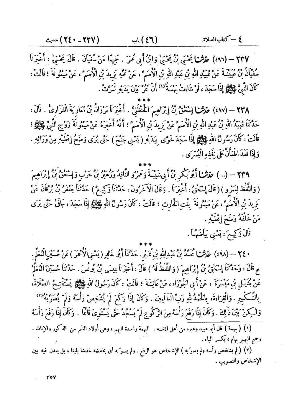 237 - (496) حَدَّثَنَا يَحْيَى بْنُ يَحْيَى، وَابْنُ أَبِي عُمَرَ، جَمِيعًا عَنْ سُفْيَانَ، قَالَ يَحْيَى: أَخْبَرَنَا، سُفْيَانُ بْنُ عُيَيْنَةَ، عَنْ عُبَيْدِ اللهِ بْنِ عَبْدِ اللهِ بْنِ الْأَصَمِّ، عَنْ عَمِّهِ يَزِيدَ بْنِ الْأَصَمِّ، عَنْ مَيْمُونَةَ، قَالَتْ: «كَانَ النَّبِيُّ صَلَّى اللهُ عَلَيْهِ وَسَلَّمَ §إِذَا سَجَدَ لَوْ شَاءَتْ بَهْمَةٌ أَنْ تَمُرَّ بَيْنَ يَدَيْهِ لَمَرَّتْ»