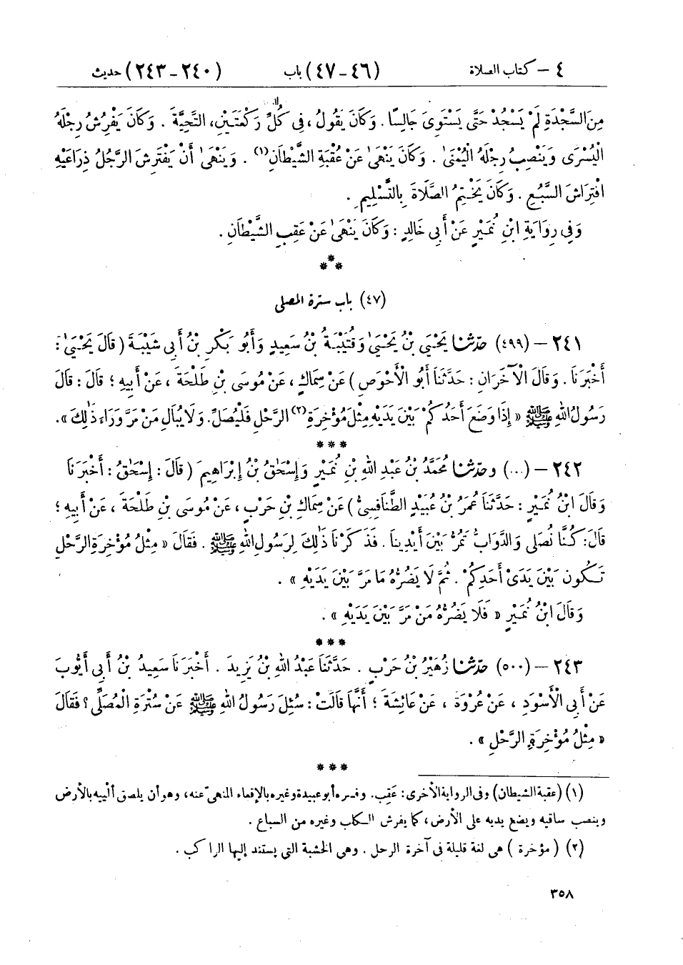 242 - (499) وَحَدَّثَنَا مُحَمَّدُ بْنُ عَبْدِ اللهِ بْنِ نُمَيْرٍ، وَإِسْحَاقُ بْنُ إِبْرَاهِيمَ، - قَالَ إِسْحَاقُ: أَخْبَرَنَا، وَقَالَ ابْنُ نُمَيْرٍ: - حَدَّثَنَا عُمَرُ بْنُ عُبَيْدٍ الطَّنَافِسِيُّ، عَنْ سِمَاكِ بْنِ حَرْبٍ، عَنْ مُوسَى بْنِ طَلْحَةَ، عَنْ أَبِيهِ، قَالَ: كُنَّا نُصَلِّي وَالدَّوَابُّ تَمُرُّ بَيْنَ أَيْدِينَا فَذَكَرْنَا ذَلِكَ لِرَسُولِ اللهِ صَلَّى اللهُ عَلَيْهِ وَسَلَّمَ فَقَالَ: «§مِثْلُ مُؤْخِرَةِ الرَّحْلِ تَكُونُ بَيْنَ يَدَيْ أَحَدِكُمْ، ثُمَّ لَا يَضُرُّهُ مَا مَرَّ بَيْنَ يَدَيْهِ» وَقَالَ ابْنُ نُمَيْرٍ: فَلَا يَضُرُّهُ مَنْ مَرَّ بَيْنَ يَدَيْهِ