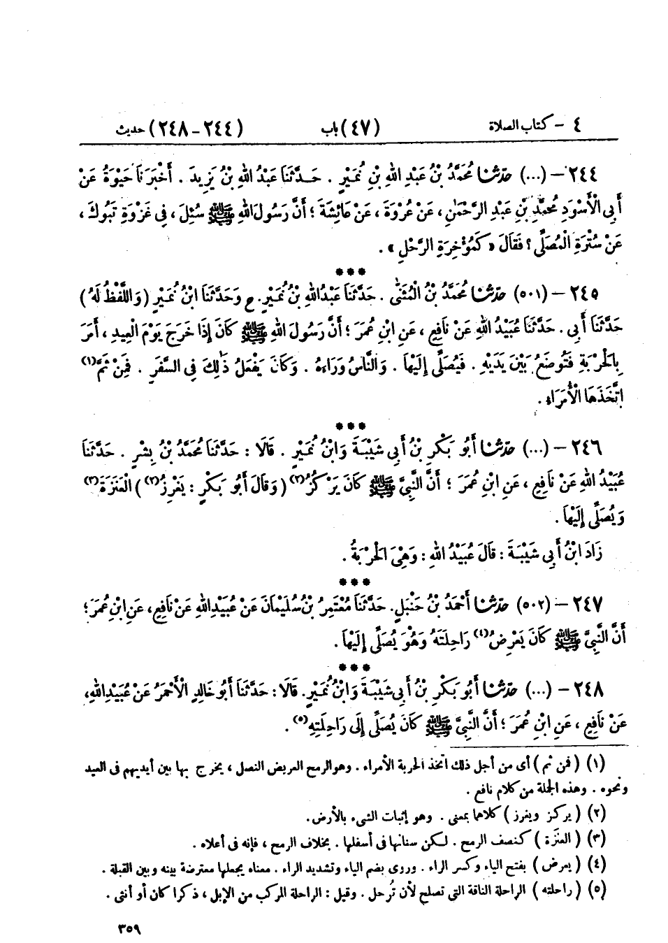 248 - (502) حَدَّثَنَا أَبُو بَكْرِ بْنُ أَبِي شَيْبَةَ، وَابْنُ نُمَيْرٍ، قَالَا: حَدَّثَنَا أَبُو خَالِدٍ الْأَحْمَرُ، عَنْ عُبَيْدِ اللهِ، عَنْ نَافِعٍ، عَنِ ابْنِ عُمَرَ: «أَنَّ النَّبِيَّ صَلَّى اللهُ عَلَيْهِ وَسَلَّمَ §كَانَ يُصَلِّي إِلَى رَاحِلَتِهِ» وَقَالَ ابْنُ نُمَيْرٍ: «إِنَّ النَّبِيَّ صَلَّى اللهُ عَلَيْهِ وَسَلَّمَ صَلَّى إِلَى بَعِيرٍ»