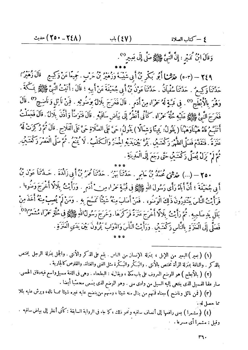 250 - (503) حَدَّثَنِي مُحَمَّدُ بْنُ حَاتِمٍ، حَدَّثَنَا بَهْزٌ، حَدَّثَنَا عُمَرُ بْنُ أَبِي زَائِدَةَ، حَدَّثَنَا عَوْنُ بْنُ أَبِي جُحَيْفَةَ، أَنَّ أَبَاهُ رَأَى رَسُولَ اللهِ صَلَّى اللهُ عَلَيْهِ وَسَلَّمَ فِي قُبَّةٍ حَمْرَاءَ مِنْ أَدَمٍ، وَرَأَيْتُ بِلَالًا أَخْرَجَ وَضُوءًا، فَرَأَيْتُ النَّاسَ يَبْتَدِرُونَ ذَلِكَ الْوَضُوءَ، فَمَنْ أَصَابَ مِنْهُ شَيْئًا تَمَسَّحَ بِهِ، وَمَنْ لَمْ يُصِبْ مِنْهُ أَخَذَ مِنْ بَلَلِ يَدِ صَاحِبِهِ، ثُمَّ رَأَيْتُ بِلَالًا أَخْرَجَ عَنَزَةً فَرَكَزَهَا «§وَخَرَجَ رَسُولُ اللهِ صَلَّى اللهُ عَلَيْهِ وَسَلَّمَ فِي حُلَّةٍ حَمْرَاءَ مُشَمِّرًا فَصَلَّى إِلَى الْعَنَزَةِ بِالنَّاسِ رَكْعَتَيْنِ، وَرَأَيْتُ النَّاسَ وَالدَّوَابَّ يَمُرُّونَ بَيْنَ يَدَيِ الْعَنَزَةِ»