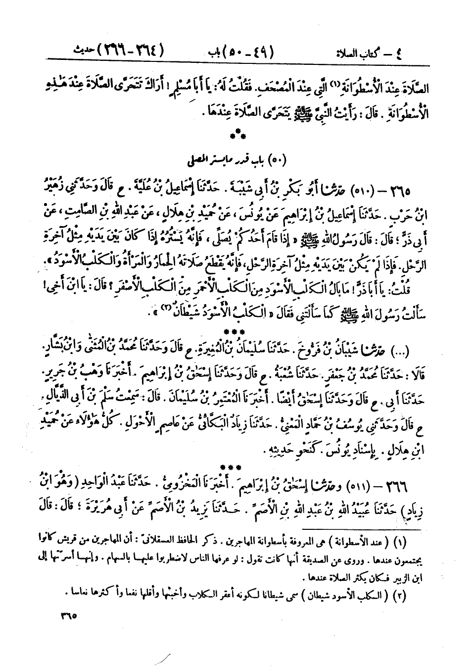 265 - (510) حَدَّثَنَا أَبُو بَكْرِ بْنُ أَبِي شَيْبَةَ، حَدَّثَنَا إِسْمَاعِيلُ ابْنُ عُلَيَّةَ، ح قَالَ: وَحَدَّثَنِي زُهَيْرُ بْنُ حَرْبٍ، حَدَّثَنَا إِسْمَاعِيلُ بْنُ إِبْرَاهِيمَ، عَنْ يُونُسَ، عَنْ حُمَيْدِ بْنِ هِلَالٍ، عَنْ عَبْدِ اللهِ بْنِ الصَّامِتِ، عَنْ أَبِي ذَرٍّ، قَالَ: قَالَ رَسُولُ اللهِ صَلَّى اللهُ عَلَيْهِ وَسَلَّمَ: «§إِذَا قَامَ أَحَدُكُمْ يُصَلِّي، فَإِنَّهُ يَسْتُرُهُ إِذَا كَانَ بَيْنَ يَدَيْهِ مِثْلُ آخِرَةِ الرَّحْلِ، فَإِذَا لَمْ يَكُنْ بَيْنَ يَدَيْهِ مِثْلُ آخِرَةِ الرَّحْلِ، فَإِنَّهُ يَقْطَعُ صَلَاتَهُ الْحِمَارُ، وَالْمَرْأَةُ، وَالْكَلْبُ الْأَسْوَدُ» قُلْتُ: يَا أَبَا ذَرٍّ، مَا بَالُ الْكَلْبِ الْأَسْوَدِ مِنَ الْكَلْبِ الْأَحْمَرِ مِنَ الْكَلْبِ الْأَصْفَرِ؟ قَالَ: يَا ابْنَ أَخِي، سَأَلْتُ رَسُولَ اللهِ صَلَّى اللهُ عَلَيْهِ وَسَلَّمَ كَمَا سَأَلْتَنِي فَقَالَ: «الْكَلْبُ الْأَسْوَدُ شَيْطَانٌ»