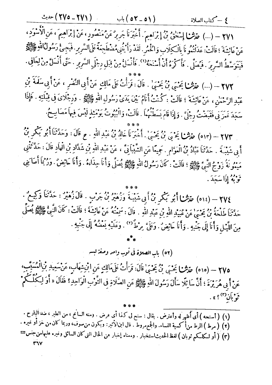 271 - (512) حَدَّثَنَا إِسْحَاقُ بْنُ إِبْرَاهِيمَ، أَخْبَرَنَا جَرِيرٌ، عَنْ مَنْصُورٍ، عَنْ إِبْرَاهِيمَ، عَنِ الْأَسْوَدِ، عَنْ عَائِشَةَ، قَالَتْ: عَدَلْتُمُونَا بِالْكِلَابِ وَالْحُمُرِ، «لَقَدْ رَأَيْتُنِي مُضْطَجِعَةً عَلَى السَّرِيرِ، فَيَجِيءُ رَسُولُ اللهِ صَلَّى اللهُ عَلَيْهِ وَسَلَّمَ فَيَتَوَسَّطُ السَّرِيرَ، §فَيُصَلِّي فَأَكْرَهُ أَنْ أَسْنَحَهُ، فَأَنْسَلُّ مِنْ قِبَلِ رِجْلَيِ السَّرِيرِ حَتَّى أَنْسَلَّ مِنْ لِحَافِي»