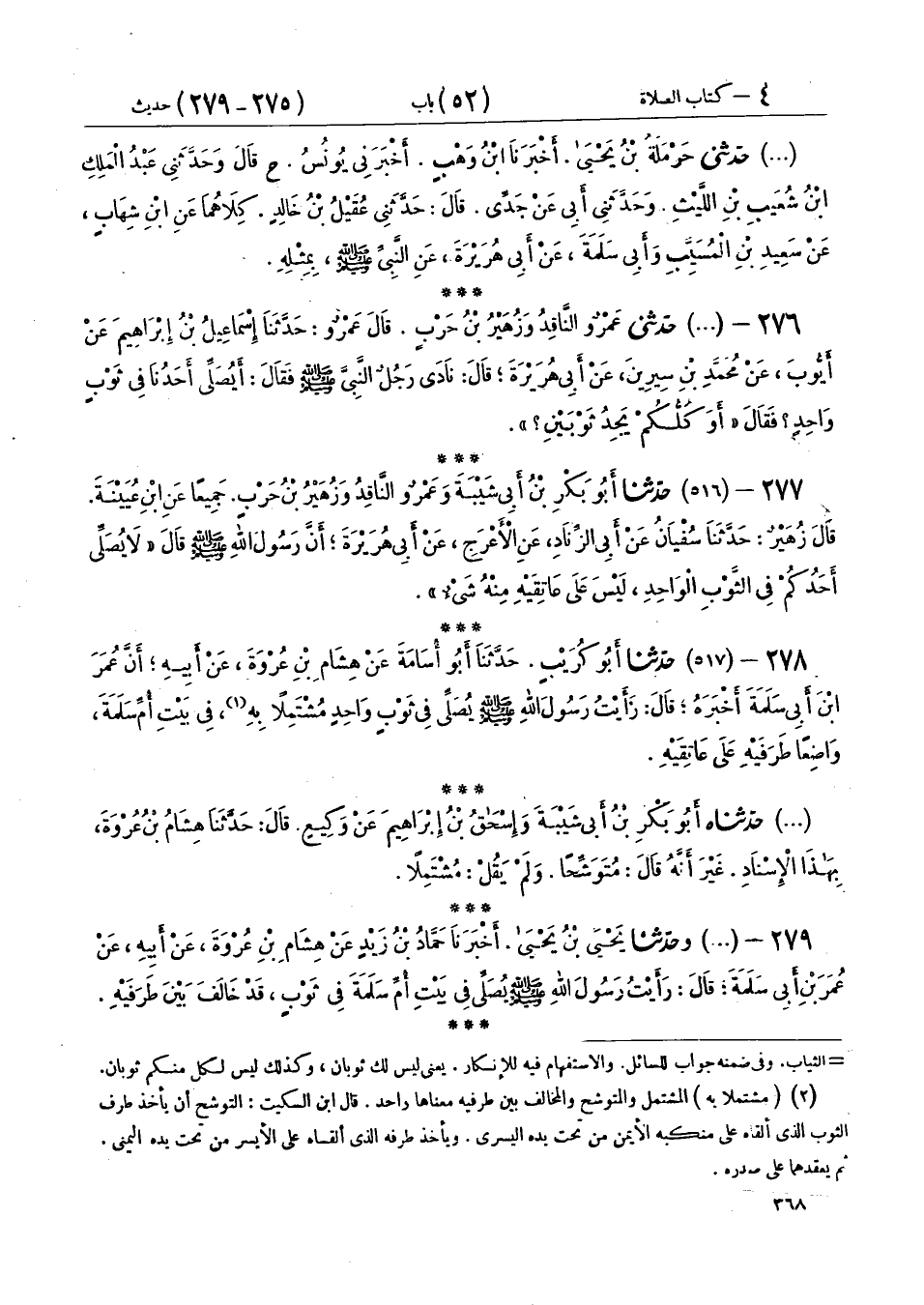 277 - (516) حَدَّثَنَا أَبُو بَكْرِ بْنُ أَبِي شَيْبَةَ، وَعَمْرٌو النَّاقِدُ، وَزُهَيْرُ بْنُ حَرْبٍ، جَمِيعًا عَنِ ابْنِ عُيَيْنَةَ، قَالَ زُهَيْرٌ: حَدَّثَنَا سُفْيَانُ، عَنْ أَبِي الزِّنَادِ، عَنِ الْأَعْرَجِ، عَنْ أَبِي هُرَيْرَةَ، أَنَّ رَسُولَ اللهِ صَلَّى اللهُ عَلَيْهِ وَسَلَّمَ قَالَ: «§لَا يُصَلِّي أَحَدُكُمْ فِي الثَّوْبِ الْوَاحِدِ لَيْسَ عَلَى عَاتِقَيْهِ مِنْهُ شَيْءٌ»