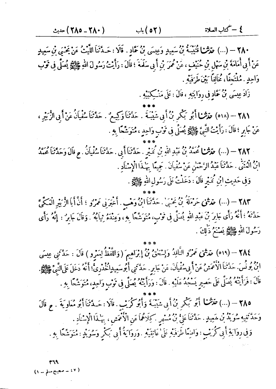 281 - (518) حَدَّثَنَا أَبُو بَكْرِ بْنُ أَبِي شَيْبَةَ، حَدَّثَنَا وَكِيعٌ، حَدَّثَنَا سُفْيَانُ، عَنْ أَبِي الزُّبَيْرِ، عَنْ جَابِرٍ، قَالَ: «رَأَيْتُ النَّبِيَّ صَلَّى اللهُ عَلَيْهِ وَسَلَّمَ §يُصَلِّي فِي ثَوْبٍ وَاحِدٍ مُتَوَشِّحًا بِهِ»