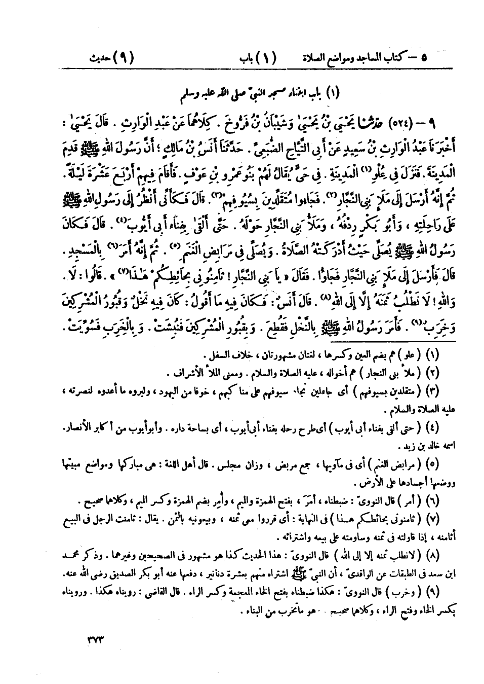 9 - (524) حَدَّثَنَا يَحْيَى بْنُ يَحْيَى، وَشَيْبَانُ بْنُ فَرُّوخَ، كِلَاهُمَا عَنْ عَبْدِ الْوَارِثِ، قَالَ يَحْيَى: أَخْبَرَنَا عَبْدُ الْوَارِثِ بْنُ سَعِيدٍ، عَنْ أَبِي التَّيَّاحِ الضُّبَعِيِّ، حَدَّثَنَا أَنَسُ بْنُ مَالِكٍ، أَنَّ رَسُولَ اللهِ صَلَّى اللهُ عَلَيْهِ وَسَلَّمَ قَدِمَ الْمَدِينَةَ، فَنَزَلَ فِي عُلْوِ الْمَدِينَةِ، فِي حَيٍّ يُقَالُ لَهُمْ بَنُو عَمْرِو بْنُ عَوْفٍ، فَأَقَامَ فِيهِمْ أَرْبَعَ عَشْرَةَ لَيْلَةً، ثُمَّ إِنَّهُ أَرْسَلَ إِلَى مَلَأِ بَنِي النَّجَّارِ، فَجَاءُوا مُتَقَلِّدِينَ بِسُيُوفِهِمْ، قَالَ: فَكَأَنِّي أَنْظُرُ إِلَى رَسُولِ اللهِ صَلَّى اللهُ عَلَيْهِ وَسَلَّمَ عَلَى رَاحِلَتِهِ، وَأَبُو بَكْرٍ رِدْفُهُ، وَمَلَأُ بَنِي النَّجَّارِ حَوْلَهُ، حَتَّى أَلْقَى بِفِنَاءِ أَبِي أَيُّوبَ، قَالَ: فَكَانَ رَسُولِ اللهِ صَلَّى اللهُ عَلَيْهِ وَسَلَّمَ يُصَلِّي حَيْثُ أَدْرَكَتْهُ الصَّلَاةُ، وَيُصَلِّي فِي مَرَابِضِ الْغَنَمِ، ثُمَّ إِنَّهُ أَمَرَ بِالْمَسْجِدِ، قَالَ فَأَرْسَلَ إِلَى مَلَأِ بَنِي النَّجَّارِ فَجَاءُوا، فَقَالَ: «يَا بَنِي النَّجَّارِ، §ثَامِنُونِي بِحَائِطِكُمْ هَذَا» قَالُوا: لَا، وَاللهِ لَا نَطْلُبُ ثَمَنَهُ إِلَّا إِلَى اللهِ، قَالَ أَنَسٌ: فَكَانَ فِيهِ مَا أَقُولُ: كَانَ فِيهِ نَخْلٌ وَقُبُورُ الْمُشْرِكِينَ وَخِرَبٌ، فَأَمَرَ رَسُولُ اللهِ صَلَّى اللهُ عَلَيْهِ وَسَلَّمَ بِالنَّخْلِ فَقُطِعَ، وَبِقُبُورِ الْمُشْرِكِينَ فَنُبِشَتْ، وَبِالْخِرَبِ فَسُوِّيَتْ، قَالَ: فَصَفُّوا النَّخْلَ قِبْلَةً، وَجَعَلُوا عِضَادَتَيْهِ حِجَارَةً، قَالَ: فَكَانُوا يَرْتَجِزُونَ، وَرَسُولُ اللهِ صَلَّى اللهُ عَلَيْهِ وَسَلَّمَ مَعَهُمْ، وَهُمْ يَقُولُونَ: «اللهُمَّ إِنَّهُ لَا خَيْرَ إِلَّا خَيْرُ الْآخِرَهْ، فَانْصُرِ الْأَنْصَارَ وَالْمُهَاجِرَهْ»