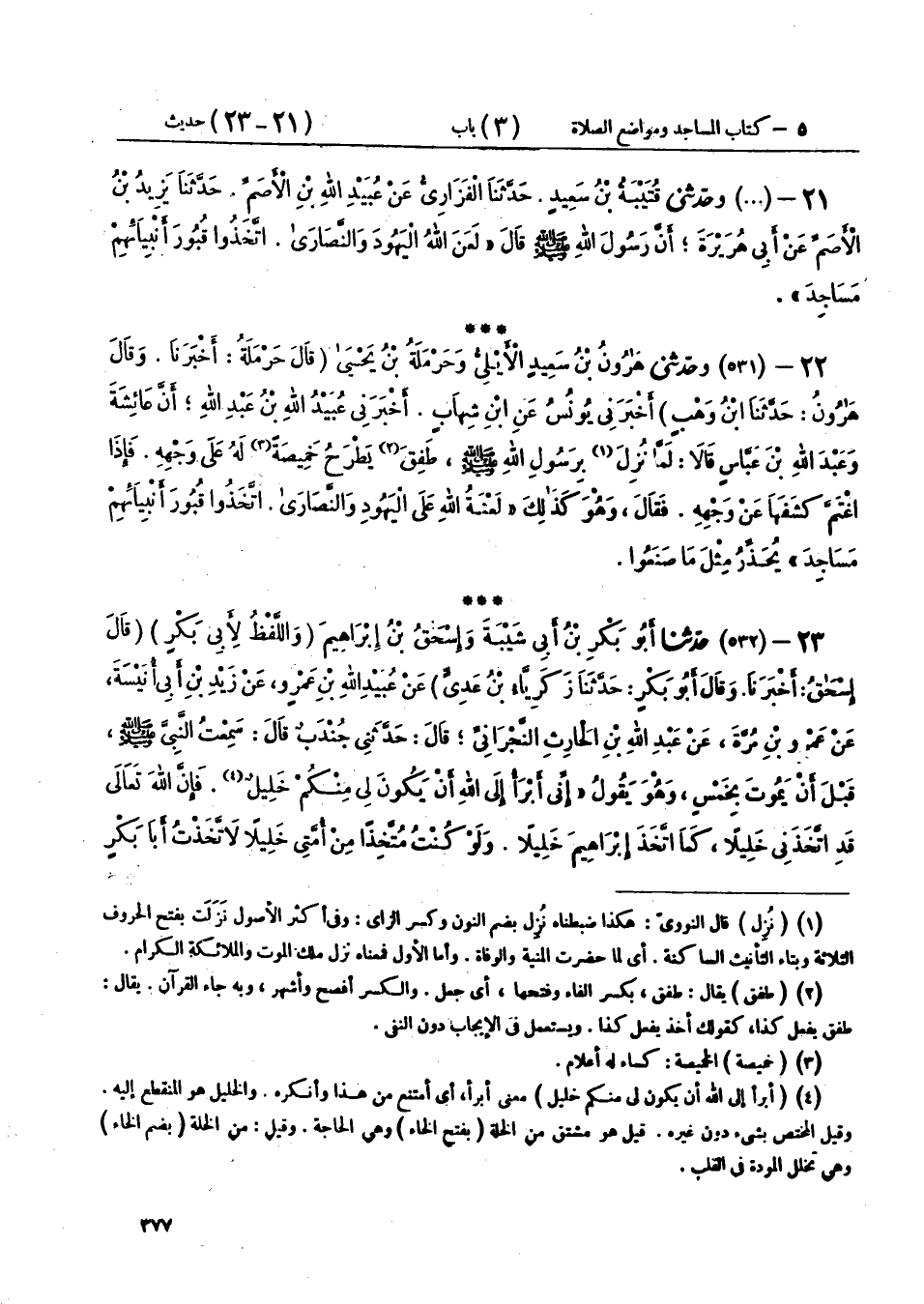 21 - (530) وَحَدَّثَنِي قُتَيْبَةُ بْنُ سَعِيدٍ، حَدَّثَنَا الْفَزَارِيُّ، عَنْ عُبَيْدِ اللهِ بْنِ الْأَصَمِّ، حَدَّثَنَا يَزِيدُ بْنُ الْأَصَمِّ، عَنْ أَبِي هُرَيْرَةَ، أَنَّ رَسُولَ اللهِ صَلَّى اللهُ عَلَيْهِ وَسَلَّمَ قَالَ: «§لَعَنَ اللهُ الْيَهُودَ وَالنَّصَارَى، اتَّخَذُوا قُبُورَ أَنْبِيَائِهِمْ مَسَاجِدَ»