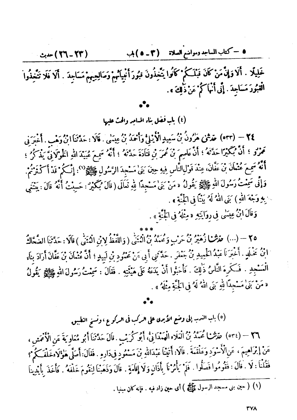 25 - (533) حَدَّثَنَا زُهَيْرُ بْنُ حَرْبٍ، وَمُحَمَّدُ بْنُ الْمُثَنَّى - وَاللَّفْظُ لِابْنِ الْمُثَنَّى - قَالَا: حَدَّثَنَا الضَّحَّاكُ بْنُ مَخْلَدٍ، أَخْبَرَنَا عَبْدُ الْحَمِيدِ بْنُ جَعْفَرٍ، حَدَّثَنِي أَبِي، عَنْ مَحْمُودِ بْنِ لَبِيدٍ، أَنَّ عُثْمَانَ بْنَ عَفَّانَ، أَرَادَ بِنَاءَ الْمَسْجِدِ، فَكَرِهَ النَّاسُ ذَلِكَ، فَأَحَبُّوا أَنْ يَدَعَهُ عَلَى هَيْئَتِهِ، فَقَالَ: سَمِعْتُ رَسُولَ اللهِ صَلَّى اللهُ عَلَيْهِ وَسَلَّمَ يَقُولُ: «§مَنْ بَنَى مَسْجِدًا لِلَّهِ بَنَى اللهُ لَهُ فِي الْجَنَّةِ مِثْلَهُ»