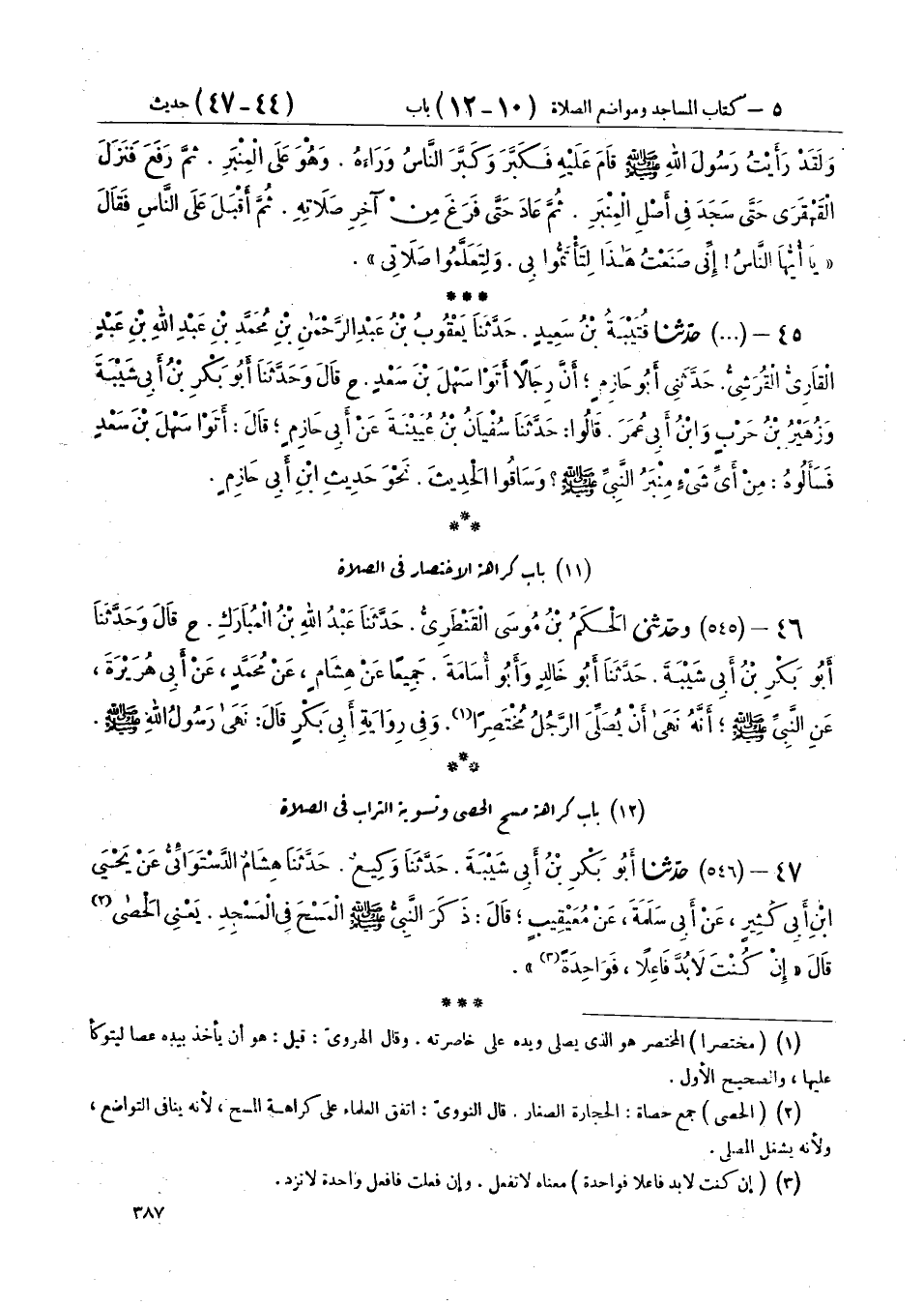 46 - (545) وحَدَّثَنِي الْحَكَمُ بْنُ مُوسَى الْقَنْطَرِيُّ، حَدَّثَنَا عَبْدُ اللهِ بْنُ الْمُبَارَكِ، ح قَالَ: وَحَدَّثَنَا أَبُو بَكْرِ بْنُ أَبِي شَيْبَةَ، حَدَّثَنَا أَبُو خَالِدٍ، وَأَبُو أُسَامَةَ، جَمِيعًا عَنْ هِشَامٍ، عَنْ مُحَمَّدٍ، عَنْ أَبِي هُرَيْرَةَ، عَنِ النَّبِيِّ صَلَّى اللهُ عَلَيْهِ وَسَلَّمَ «أَنَّهُ §نَهَى أَنْ يُصَلِّيَ الرَّجُلُ مُخْتَصِرًا» وَفِي رِوَايَةِ أَبِي بَكْرِ قَالَ: نَهَى رَسُولُ اللهِ صَلَّى اللهُ عَلَيْهِ وَسَلَّمَ