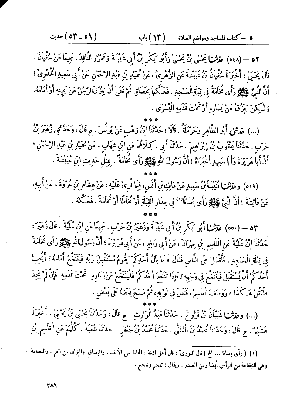 52 - (548) حَدَّثَنَا يَحْيَى بْنُ يَحْيَى، وَأَبُو بَكْرِ بْنُ أَبِي شَيْبَةَ، وَعَمْرٌو النَّاقِدُ، جَمِيعًا عَنْ سُفْيَانَ، قَالَ يَحْيَى: أَخْبَرَنَا سُفْيَانُ بْنُ عُيَيْنَةَ، عَنِ الزُّهْرِيِّ، عَنْ حُمَيْدِ بْنِ عَبْدِ الرَّحْمَنِ، عَنْ أَبِي سَعِيدٍ الْخُدْرِيِّ: «أَنَّ النَّبِيَّ صَلَّى اللهُ عَلَيْهِ وَسَلَّمَ §رَأَى نُخَامَةً فِي قِبْلَةِ الْمَسْجِدِ فَحَكَّهَا بِحَصَاةٍ، ثُمَّ نَهَى أَنْ يَبْزُقَ الرَّجُلُ عَنْ يَمِينِهِ، أَوْ أَمَامَهُ، وَلَكِنْ يَبْزُقُ، عَنْ يَسَارِهِ أَوْ تَحْتَ قَدَمِهِ الْيُسْرَى» ح