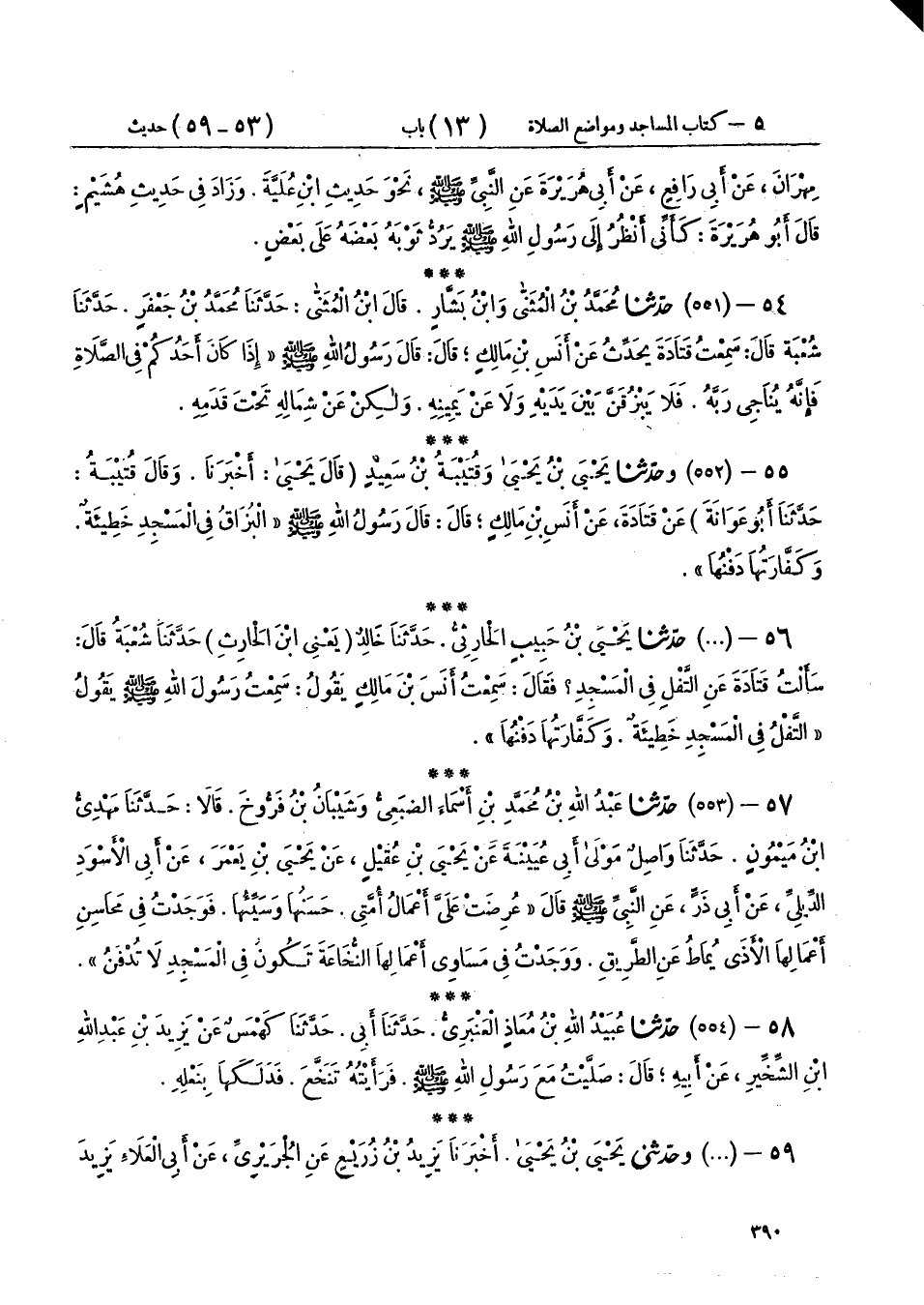 56 - (552) حَدَّثَنَا يَحْيَى بْنُ حَبِيبٍ الْحَارِثِيُّ، حَدَّثَنَا خَالِدٌ يَعْنِي ابْنَ الْحَارِثِ، حَدَّثَنَا شُعْبَةُ، قَالَ: سَأَلْتُ قَتَادَةَ، عَنِ التَّفْلِ، فِي الْمَسْجِدِ، فَقَالَ: سَمِعْتُ أَنَسَ بْنَ مَالِكٍ، يَقُولُ: سَمِعْتُ رَسُولَ اللهِ صَلَّى اللهُ عَلَيْهِ وَسَلَّمَ يَقُولُ: «§التَّفْلُ فِي الْمَسْجِدِ خَطِيئَةٌ، وَكَفَّارَتُهَا دَفْنُهَا»