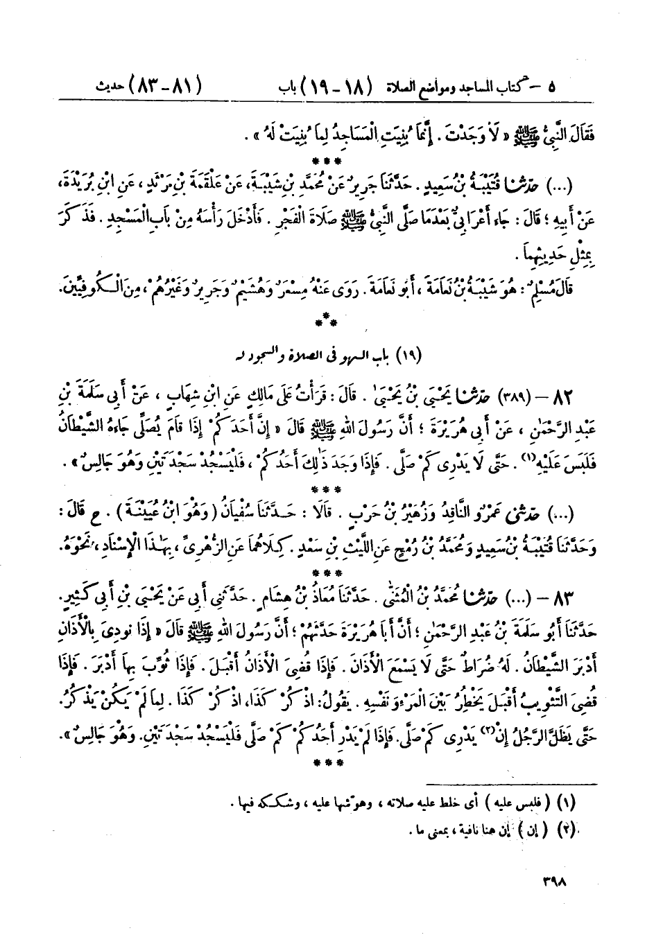 82 - (389) حَدَّثَنَا يَحْيَى بْنُ يَحْيَى، قَالَ: قَرَأْتُ عَلَى مَالِكٍ، عَنِ ابْنِ شِهَابٍ، عَنْ أَبِي سَلَمَةَ بْنِ عَبْدِ الرَّحْمَنِ، عَنْ أَبِي هُرَيْرَةَ، أَنَّ رَسُولَ اللهِ صَلَّى اللهُ عَلَيْهِ وَسَلَّمَ قَالَ: «إِنَّ §أَحَدَكُمْ، إِذَا قَامَ يُصَلِّي جَاءَهُ الشَّيْطَانُ فَلَبَسَ عَلَيْهِ، حَتَّى لَا يَدْرِيَ كَمْ صَلَّى، فَإِذَا وَجَدَ ذَلِكَ أَحَدَكُمْ، فَلْيَسْجُدْ سَجْدَتَيْنِ وَهُوَ جَالِسٌ»