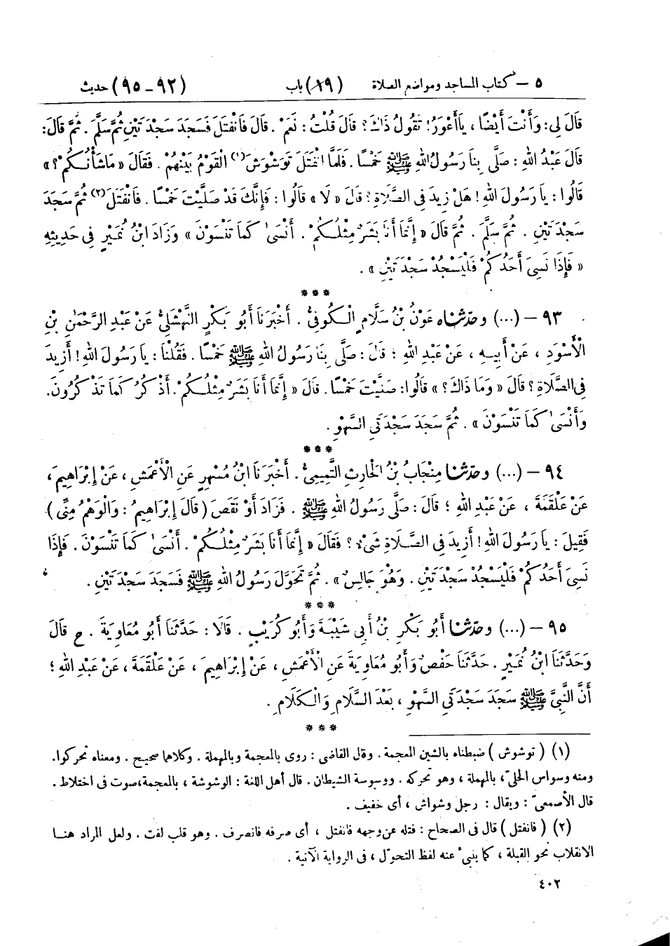95 - (572) وَحَدَّثَنَا أَبُو بَكْرِ بْنُ أَبِي شَيْبَةَ، وَأَبُو كُرَيْبٍ، قَالَا: حَدَّثَنَا أَبُو مُعَاوِيَةَ، ح قَالَ: وَحَدَّثَنَا ابْنُ نُمَيْرٍ، حَدَّثَنَا حَفْصٌ، وَأَبُو مُعَاوِيَةَ، عَنِ الْأَعْمَشِ، عَنْ إِبْرَاهِيمَ، عَنْ عَلْقَمَةَ، عَنْ عَبْدِ اللهِ، أَنَّ النَّبِيَّ صَلَّى اللهُ عَلَيْهِ وَسَلَّمَ «§سَجَدَ سَجْدَتَيِ السَّهْوِ بَعْدَ السَّلَامِ وَالْكَلَامِ»