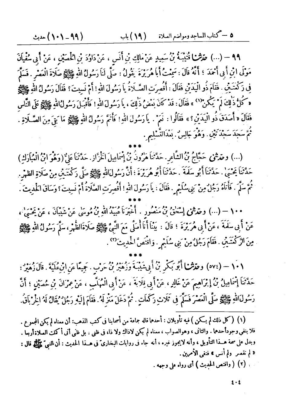 101 - (574) وَحَدَّثَنَا أَبُو بَكْرِ بْنُ أَبِي شَيْبَةَ، وَزُهَيْرُ بْنُ حَرْبٍ، جَمِيعًا عَنِ ابْنِ عُلَيَّةَ، قَالَ زُهَيْرٌ: حَدَّثَنَا إِسْمَاعِيلُ بْنُ إِبْرَاهِيمَ، عَنْ خَالِدٍ، عَنْ أَبِي قِلَابَةَ، عَنْ أَبِي الْمُهَلَّبِ، عَنْ عِمْرَانَ بْنِ حُصَيْنٍ، أَنَّ رَسُولَ اللهِ صَلَّى اللهُ عَلَيْهِ وَسَلَّمَ صَلَّى الْعَصْرَ، فَسَلَّمَ فِي ثَلَاثِ رَكَعَاتٍ، ثُمَّ دَخَلَ مَنْزِلَهُ، فَقَامَ إِلَيْهِ رَجُلٌ يُقَالُ لَهُ الْخِرْبَاقُ، وَكَانَ فِي يَدَيْهِ طُولٌ، فَقَالَ: يَا رَسُولَ اللهِ فَذَكَرَ لَهُ صَنِيعَهُ، وَخَرَجَ غَضْبَانَ يَجُرُّ رِدَاءَهُ، حَتَّى انْتَهَى إِلَى النَّاسِ، فَقَالَ: أَصَدَقَ هَذَا قَالُوا: نَعَمْ، «§فَصَلَّى رَكْعَةً، ثُمَّ سَلَّمَ، ثُمَّ سَجَدَ سَجْدَتَيْنِ، ثُمَّ سَلَّمَ»