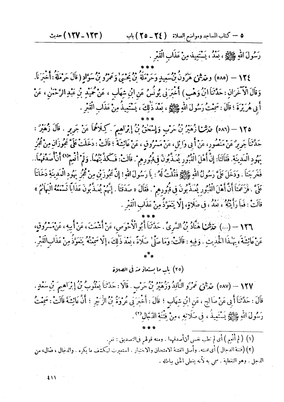 127 - (587) حَدَّثَنِي عَمْرٌو النَّاقِدُ، وَزُهَيْرُ بْنُ حَرْبٍ، قَالَا: حَدَّثَنَا يَعْقُوبُ بْنُ إِبْرَاهِيمَ بْنِ سَعْدٍ، قَالَ: حَدَّثَنَا أَبِي، عَنْ صَالِحٍ، عَنِ ابْنِ شِهَابٍ، قَالَ: أَخْبَرَنِي عُرْوَةُ بْنُ الزُّبَيْرِ، أَنَّ عَائِشَةَ، قَالَتْ: «سَمِعْتُ رَسُولَ اللهِ صَلَّى اللهُ عَلَيْهِ وَسَلَّمَ §يَسْتَعِيذُ فِي صَلَاتِهِ مِنْ فِتْنَةِ الدَّجَّالِ»