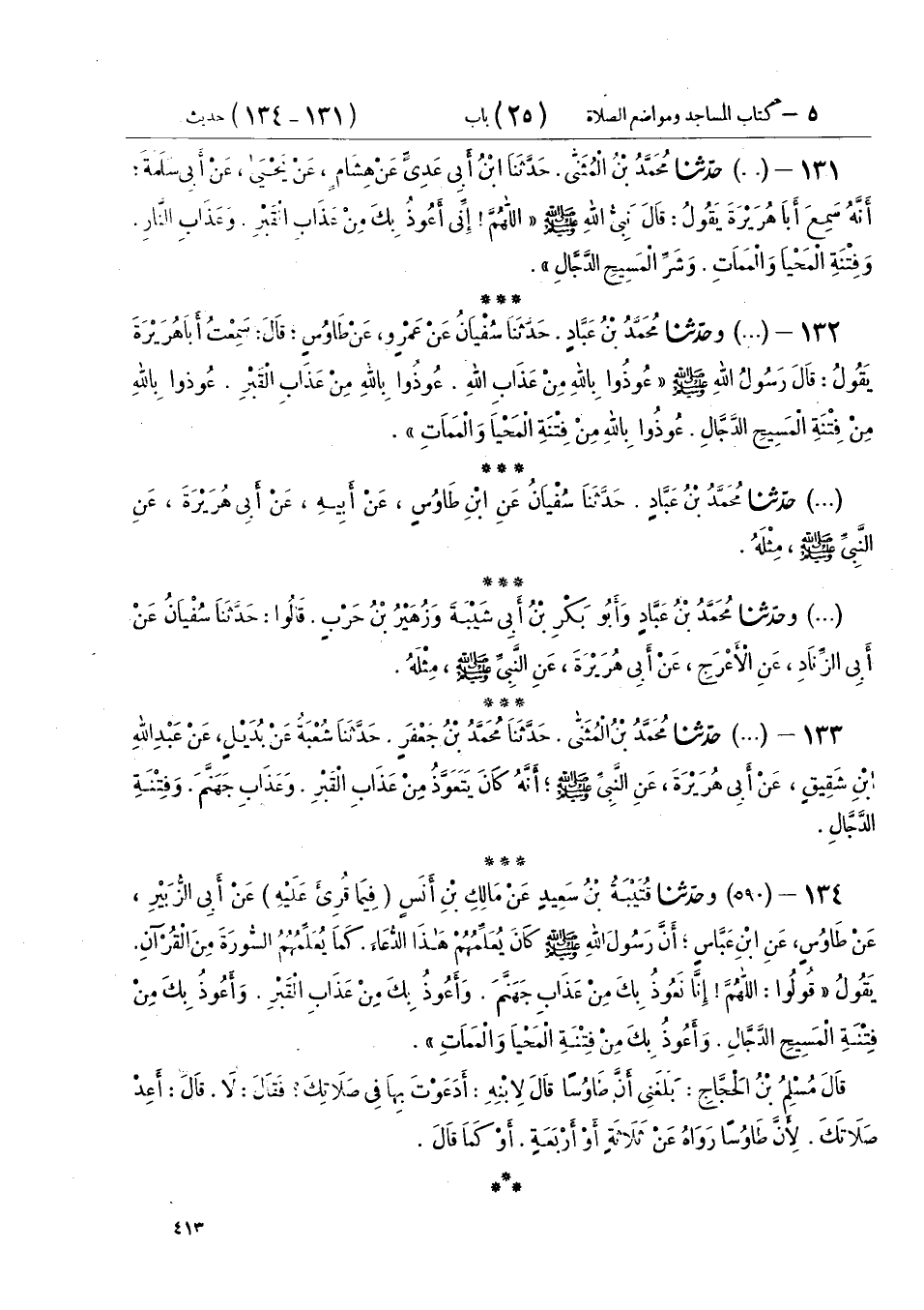 134 - (590) وَحَدَّثَنَا قُتَيْبَةُ بْنُ سَعِيدٍ، عَنْ مَالِكِ بْنِ أَنَسٍ، فِيمَا قُرِئَ عَلَيْهِ عَنْ أَبِي الزُّبَيْرِ، عَنْ طَاوُسٍ، عَنِ ابْنِ عَبَّاسٍ، أَنَّ رَسُولَ اللهِ صَلَّى اللهُ عَلَيْهِ وَسَلَّمَ كَانَ يُعَلِّمُهُمْ هَذَا الدُّعَاءَ كَمَا يُعَلِّمُهُمُ السُّورَةَ مِنَ الْقُرْآنِ يَقُولُ قُولُوا: «§اللهُمَّ إِنَّا نَعُوذُ بِكَ مِنْ عَذَابِ جَهَنَّمَ، وَأَعُوذُ بِكَ مِنْ عَذَابِ الْقَبْرِ، وَأَعُوذُ بِكَ مِنْ فِتْنَةِ الْمَسِيحِ الدَّجَّالِ، وَأَعُوذُ بِكَ مِنْ فِتْنَةِ الْمَحْيَا وَالْمَمَاتِ» قَالَ مُسْلِمُ بْنُ الْحَجَّاجِ: " بَلَغَنِي أَنَّ طَاوُسًا قَالَ لِابْنِهِ: أَدَعَوْتَ بِهَا فِي صَلَاتِكَ؟ فَقَالَ: لَا، قَالَ: أَعِدْ صَلَاتَكَ، لِأَنَّ طَاوُسًا رَوَاهُ عَنْ ثَلَاثَةٍ أَوْ أَرْبَعَةٍ، أَوْ كَمَا قَالَ "