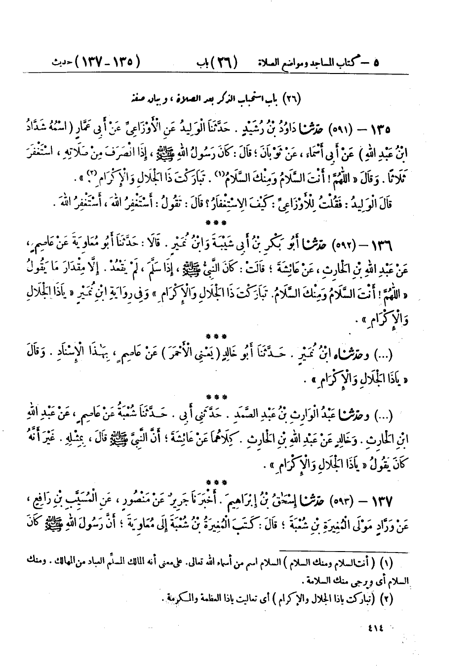 135 - (591) حَدَّثَنَا دَاوُدُ بْنُ رُشَيْدٍ، حَدَّثَنَا الْوَلِيدُ، عَنِ الْأَوْزَاعِيِّ، عَنْ أَبِي عَمَّارٍ، اسْمُهُ شَدَّادُ بْنُ عَبْدِ اللهِ، عَنْ أَبِي أَسْمَاءَ، عَنْ ثَوْبَانَ، قَالَ: كَانَ رَسُولُ اللهِ صَلَّى اللهُ عَلَيْهِ وَسَلَّمَ، إِذَا انْصَرَفَ مِنْ صَلَاتِهِ اسْتَغْفَرَ ثَلَاثًا وَقَالَ: «§اللهُمَّ أَنْتَ السَّلَامُ وَمِنْكَ السَّلَامُ، تَبَارَكْتَ ذَا الْجَلَالِ وَالْإِكْرَامِ» قَالَ الْوَلِيدُ: فَقُلْتُ لِلْأَوْزَاعِيِّ: " كَيْفَ الْاسْتِغْفَارُ؟ قَالَ: تَقُولُ: أَسْتَغْفِرُ اللهَ، أَسْتَغْفِرُ اللهَ "